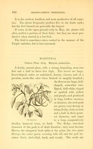 | Keywords: The field and garden vegetables of America (Page 612) (6002099421).jpg 612 <br> MISCELLANEOUS VEGETABLES <br> It is the earliest hardiest and most productive of all varie- <br> ties The plants frequently produce five or six fruits each ; <br> but the first formed are generally the largest <br> If sown in the open ground early in May the plants will <br> often perfect a portion of their fruit ; but they are most pro- <br> ductive when started in a hot-bed <br> The fruit is sometimes eaten cooked in the manner of the <br> Purple varieties but is less esteemed <br> MARTYNIA <br> Unicorn Plant Gray Martynia proboscidea <br> A hardy annual plant with a strong branching stem two <br> feet and a half or three feet high The leaves are large <br> heart-shaped entire or undulated doAvny viscous and of a <br> peculiar musk-like odor when bruised or roughly handled ; <br> the flowers are large bell- <br> shaped somewhat two- <br> lipped dull-white tinged <br> or spotted with yellow <br> and purple and produced <br> in long leafless racemes <br> or clusters ; the seed-pods <br> are green very downy or <br> hairy fleshy oval an inch <br> and a half in their great- <br> est diameter and taper <br> The Martynia tO a ldlg COllipa HI t \ Ay <br> slender incurved horn or beak The fleshy succulent <br> character of the pods is of short duration they soon become <br> fibrous the elongated beak splits at the point the two parts <br> diverge the outer green covering falls off and the pod be- <br> comes black shrivelled hard and woody The seeds are 29062950 92326 42073 Page 612 Text http //www biodiversitylibrary org/page/29062950 1863 10 5962/bhl title 42073 Burr Fearing NameFound Martynia NameConfirmed Martynia L EOLID 61735 NameFound Martynia proboscidea NameConfirmed Martynia proboscidea Gloxin EOLID 492400 NameBankID 617768 Biodiversity Heritage Library The field and garden vegetables of America United States Varieties Vegetable gardening Vegetables Library Congress bhl page 29062950 dc identifier http //biodiversitylibrary org/page/29062950 united states Information field Flickr posted date ISOdate 2011-08-02 CC-BY-2 0 BioDivLibrary https //flickr com/photos/61021753 N02/6002099421 2015-09-10 20 56 06 cc-by-2 0 PD-old-70-1923 The field and garden vegetables of America Photos uploaded from Flickr by Fæ using a script |