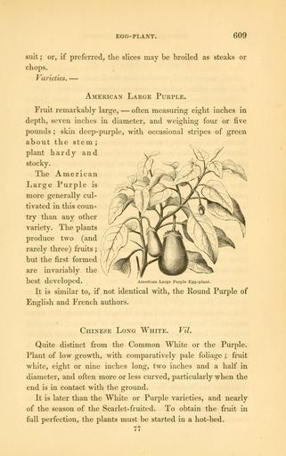 | Keywords: The field and garden vegetables of America (Page 609) (6002646044).jpg EGG-PLANT <br> 609 <br> suit ; or if preferred the slices may be broiled as steaks or <br> chops <br> Varieties ” <br> American Large Purple <br> Fruit remarkably large ” often measuring eight inches in <br> depth seven inches in diameter and weighing four or five <br> pounds ; skin deep-purple with occasional stripes of green <br> about the stem; <br> plant hardy and <br> stocky <br> The American <br> Large Purple is <br> more generally cul- <br> tivated in this coun- <br> try than any other <br> variety The plants <br> produce two and <br> rarely three fruits ; <br> but the first formed j <br> are invariably the <br> best developed American Large Purple Egg-plant <br> It is similar to if not identical with the Pound Purple of <br> English and French authors <br> Chinese Long White Vil <br> Quite distinct from the Common White or the Purple <br> Plant of low growth with comparatively pale foliage ; fruit <br> white eight or nine inches long two inches and a half in <br> diameter and often more or less curved particularly when the <br> end is in contact with the ground <br> It is later than the White or Purple varieties and nearly <br> of the season of the Scarlet-fruited To obtain the fruit in <br> full perfection the plants must be started in a hot-bed <br> 77 29062947 92326 42073 Page 609 Text http //www biodiversitylibrary org/page/29062947 1863 10 5962/bhl title 42073 Burr Fearing Biodiversity Heritage Library The field and garden vegetables of America United States Varieties Vegetable gardening Vegetables Library Congress bhl page 29062947 dc identifier http //biodiversitylibrary org/page/29062947 united states Information field Flickr posted date ISOdate 2011-08-02 CC-BY-2 0 BioDivLibrary https //flickr com/photos/61021753 N02/6002646044 2015-09-10 21 00 01 cc-by-2 0 PD-old-70-1923 The field and garden vegetables of America Photos uploaded from Flickr by Fæ using a script |