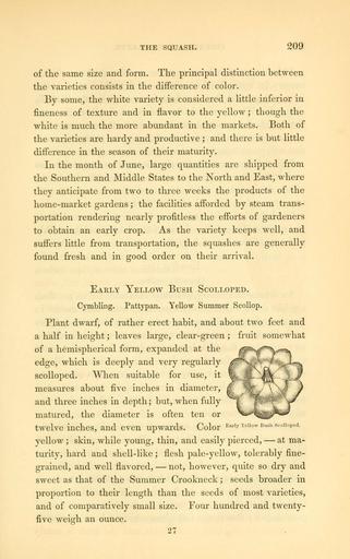 Keywords: The field and garden vegetables of America (Page 209) (6002095285).jpg THE SQUASH 209 <br> of the same size and form The principal distinction between <br> the varieties consists in the difference of color <br> By some the white variety is considered a little inferior in <br> fineness of texture and in flavor to the yellow ; though the <br> white is much the more abundant in the markets Both of <br> the varieties are hardy and productive ; and there is but little <br> difference in the season of their maturity <br> In the month of June large quantities are shipped from <br> the Southern and Middle States to the North and East where <br> they anticipate from two to three weeks the products of the <br> home-market gardens ; the facilities afforded by steam trans- <br> portation rendering nearly profitless the efforts of gardeners <br> to obtain an early crop As the variety keeps well and <br> suffers little from transportation the squashes are generally <br> found fresh and in good order on their arrival <br> Early Yellow Bush Scolloped <br> Cymbling Pattypan Yellow Summer Scollop <br> Plant dwarf of rather erect habit and about two feet and <br> a half in height ; leaves large clear-green ; fruit somewhat <br> of a hemispherical form expanded at the <br> edge which is deeply and very regularly <br> scolloped When suitable for use it <br> measures about five inches in diameter <br> and three inches in depth ; but when fully <br> matured the diameter is often ten or <br> twelve inches and even upwards Color – – fr YeUow Bash 8coUo P ed - <br> yellow ; skin while young thin and easily pierced ” at ma- <br> turity hard and shell-like ; flesh pale-yellow tolerably fine- <br> grained and well flavored ” not however quite so dry and <br> sweet as that of the Summer Crookneck ; seeds broader in <br> proportion to their length than the seeds of most varieties <br> and of comparatively small size Four hundred and twenty- <br> five weigh an ounce <br> 27 29062547 92326 42073 Page 209 Text http //www biodiversitylibrary org/page/29062547 1863 10 5962/bhl title 42073 Burr Fearing Biodiversity Heritage Library The field and garden vegetables of America United States Varieties Vegetable gardening Vegetables Library Congress bhl page 29062547 dc identifier http //biodiversitylibrary org/page/29062547 united states Information field Flickr posted date ISOdate 2011-08-02 CC-BY-2 0 BioDivLibrary https //flickr com/photos/61021753 N02/6002095285 2015-09-10 20 51 12 cc-by-2 0 PD-old-70-1923 The field and garden vegetables of America Photos uploaded from Flickr by Fæ using a script |