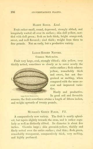 Keywords: The field and garden vegetables of America (Page 186) (6002094187).jpg 186 CUCURBITACEOUS PLANTS <br> Hardy Ridge Loud <br> Fruit rather small round depressed strongly ribbed and <br> irregularly warted all over its surface ; skin dull yellow mot- <br> tled with dull green ; flesh an inch thick bright orange-red <br> sweet and well flavored ; rind thick ; weight from three to <br> four pounds Not an early but a productive variety <br> Large-Ribbed Netted <br> Common Musk-melon <br> Fruit very large oval strongly ribbed ; skin yellow very <br> thickly netted sometimes so closely as to cover nearly the <br> lv i - « - _ entire surface ; flesh salmon- <br> yellow remarkably thick <br> and sweet but not fine- <br> grained or melting when <br> compared with the more re- <br> cent and improved varie- <br> ties <br> Hardy and productive <br> Large Netted Musk-melon In gOOd Soil and faVOrablc <br> seasons the fruit sometimes attains a length of fifteen inches <br> and weighs upwards of twenty pounds <br> Munroe's Green Flesh Vil <br> A comparatively new variety The fruit is nearly spheri- <br> cal but tapers slightly towards the stem and is rather regu- <br> larly as well as distinctly ribbed Its diameter is about five <br> inches Cicatrix large ; skin greenish-yellow thickly and <br> finely netted over the entire surface ; rind thin ; flesh green <br> remarkably transparent comparatively thick very melting <br> and highly perfumed 29062524 92326 42073 Page 186 Text http //www biodiversitylibrary org/page/29062524 1863 10 5962/bhl title 42073 Burr Fearing Biodiversity Heritage Library The field and garden vegetables of America United States Varieties Vegetable gardening Vegetables Library Congress bhl page 29062524 dc identifier http //biodiversitylibrary org/page/29062524 united states Information field Flickr posted date ISOdate 2011-08-02 CC-BY-2 0 BioDivLibrary https //flickr com/photos/61021753 N02/6002094187 2015-09-10 20 51 15 cc-by-2 0 PD-old-70-1923 The field and garden vegetables of America Photos uploaded from Flickr by Fæ using a script |