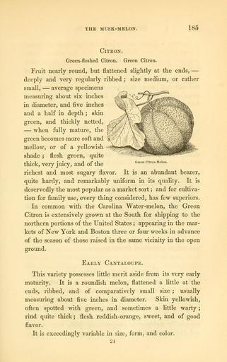 Keywords: The field and garden vegetables of America (Page 185) (6002640882).jpg THE MUSK-MELON <br> 185 <br> Green Citron Melon <br> Citron <br> Green-fleshed Citron Green Citron <br> Fruit nearly round but flattened slightly at the ends <br> deeply and very regularly ribbed ; size medium or rather <br> small average specimens <br> measuring about six inches <br> in diameter and five inches <br> and a half in depth ; skin <br> green and thickly netted <br> when fully mature the <br> green becomes more soft and <br> mellow or of a yellowish <br> shade ; flesh green quite <br> thick very juicy and of the <br> richest and most sugary flavor It is an abundant bearer <br> quite hardy and remarkably uniform in its quality It is <br> deservedly the most popular as a market sort ; and for cultiva- <br> tion for family use every thing considered has few superiors <br> In common with the Carolina Water-melon the Green <br> Citron is extensively grown at the South for shipping to the <br> northern portions of the United States ; appearing in the mar- <br> kets of New York and Boston three or four weeks in advance <br> of the season of those raised in the same vicinity in the open <br> ground <br> Eakly Cantaloupe <br> This variety possesses little merit aside from its very early <br> maturity It is a roundish melon flattened a little at the <br> ends ribbed and of comparatively small size ; usually <br> measuring about five inches in diameter Skin yellowish <br> often spotted with green and sometimes a little warty ; <br> rirtd quite thick; flesh reddish-orange sweet and of good <br> flavor <br> It is exceedingly variable in size form and color <br> 24 29062523 92326 42073 Page 185 Text http //www biodiversitylibrary org/page/29062523 1863 10 5962/bhl title 42073 Burr Fearing Biodiversity Heritage Library The field and garden vegetables of America United States Varieties Vegetable gardening Vegetables Library Congress bhl page 29062523 dc identifier http //biodiversitylibrary org/page/29062523 united states Information field Flickr posted date ISOdate 2011-08-02 CC-BY-2 0 BioDivLibrary https //flickr com/photos/61021753 N02/6002640882 2015-09-10 20 59 22 cc-by-2 0 PD-old-70-1923 The field and garden vegetables of America Photos uploaded from Flickr by FĂŚ using a script |