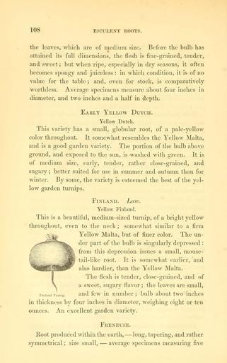 Keywords: The field and garden vegetables of America (Page 108) (6002638342).jpg 108 ESCULENT ROOTS <br> the leaves which are of medium size Before the bulb has <br> attained its full dimensions the flesh is fine-grained tender <br> and sweet ; but when ripe especially in dry seasons it often <br> becomes spongy and juiceless in which condition it is of no <br> value for the table ; and even for stock is comparatively <br> worthless Average specimens measure about four inches in <br> diameter and two inches and a half in depth <br> Early Yellow Dutch <br> Yellow Dutch <br> This variety has a small globular root of a pale-yelloAv <br> color throughout It somewhat resembles the Yellow Malta <br> and is a good garden variety The portion of the bulb above <br> ground and exposed to the sun is washed with green It is <br> of medium size early tender rather close-grained and <br> sugary ; better suited for use in summer and autumn than for <br> winter By some the variety is esteemed the best of the yel- <br> low garden turnips <br> Finland Law <br> Yellow Finland <br> This is a beautiful medium-sized turnip of a bright yellow <br> throughout even to the neck; somewhat similar to a firm <br> Yellow Malta but of finer color The un- <br> der part of the bulb is singularly depressed <br> from this depression issues a small mouse- <br> tail-like root It is somewhat earlier and <br> also hardier than the Yellow Malta <br> The flesh is tender close-grained and of <br> a sweet sugary flavor ; the leaves are small <br> and few in number ; bulb about two inches <br> in thickness by four inches in diameter weighing eight or ten <br> ounces An excellent garden variety <br> Freneuse <br> Root produced within the earth ” long tapering and rather <br> symmetrical ; size small ” average specimens measuring five 29062446 92326 42073 Page 108 Text http //www biodiversitylibrary org/page/29062446 1863 10 5962/bhl title 42073 Burr Fearing Biodiversity Heritage Library The field and garden vegetables of America United States Varieties Vegetable gardening Vegetables Library Congress bhl page 29062446 dc identifier http //biodiversitylibrary org/page/29062446 united states Information field Flickr posted date ISOdate 2011-08-02 CC-BY-2 0 BioDivLibrary https //flickr com/photos/61021753 N02/6002638342 2015-09-10 20 59 03 cc-by-2 0 PD-old-70-1923 The field and garden vegetables of America Photos uploaded from Flickr by Fæ using a script |