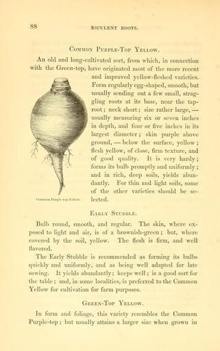 | Keywords: The field and garden vegetables of America (Page 88) (6002636916).jpg 88 <br> ESCULENT ROOTS <br> Common Pukple-Top Yellow <br> An old and long-cultivated sort from which in connection <br> with the Green-top have originated most of the more recent <br> and improved yellow-fleshed varieties <br> Form regularly egg-shaped smooth but <br> usually sending out a few small strag- <br> gling roots at its base near the tap- <br> root ; neck short ; size rather large ” <br> usually measuring six or seven inches <br> in depth and four or five inches in its <br> largest diameter ; skin purple above <br> ground ” below the surface yellow ; <br> flesh yellow of close firm texture and <br> of good quality It is very hardy ; <br> forms its bulb promptly and uniformly ; <br> and in rich deep soils yields abun- <br> dantly For thin and light soils some <br> of the other varieties should be se- <br> Common Purple-top Yellow lected <br> Early Stubble <br> Bulb round smooth and regular The skin where ex- <br> posed to light and air is of a brownish-green ; but where <br> covered by the soil yellow The flesh is firm and well <br> flavored <br> The Early Stubble is recommended as forming its bulbs <br> quickly and uniformly and as being well adapted for late <br> sowing It yields abundantly; keeps well ; is a good sort for <br> the table ; and in some localities is preferred to the Common <br> Yellow for cultivation for farm purposes <br> Green-Top Yellow <br> In form and foliage this variety resembles the Common <br> Purple-top ; but usually attains a larger size when grown in 29062426 92326 42073 Page 88 Text http //www biodiversitylibrary org/page/29062426 1863 10 5962/bhl title 42073 Burr Fearing Biodiversity Heritage Library The field and garden vegetables of America United States Varieties Vegetable gardening Vegetables Library Congress bhl page 29062426 dc identifier http //biodiversitylibrary org/page/29062426 united states Information field Flickr posted date ISOdate 2011-08-02 CC-BY-2 0 BioDivLibrary https //flickr com/photos/61021753 N02/6002636916 2015-09-10 20 57 31 cc-by-2 0 PD-old-70-1923 The field and garden vegetables of America Photos uploaded from Flickr by Fæ using a script |