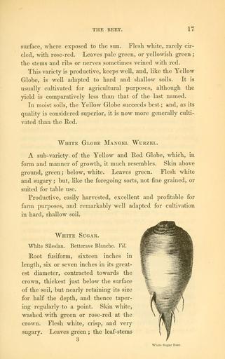 | Keywords: The field and garden vegetables of America (Page 17) (6002086063).jpg THE BEET <br> 17 <br> surface where exposed to the sun Flesh white rarely cir- <br> cled with rose-red Leaves pale green or yellowish green ; <br> the stems and ribs or nerves sometimes veined with red <br> This variety is productive keeps well and like the Yellow <br> Globe is well adapted to hard and shallow soils It is <br> usually cultivated for agricultural purposes although the <br> yield is comparatively less than that of the last named <br> In moist soils the Yellow Globe succeeds best ; and as its <br> quality is considered superior it is now more generally culti- <br> vated than the Red <br> White Globe Mangel Wurzel <br> A sub- variety of the Yellow and Red Globe which in <br> form and manner of growth it much resembles Skin above <br> ground green; below white Leaves green Flesh white <br> and sugary ; but like the foregoing sorts not fine grained or <br> suited for table use <br> Productive easily harvested excellent and profitable for <br> farm purposes and remarkably well adapted for cultivation <br> in hard shallow soil <br> White Sugar <br> White Silesian Betterave Blanche Vil <br> Root fusiform sixteen inches in <br> length six or seven inches in its great- <br> est diameter contracted towards the <br> crown thickest just below the surface <br> of the soil but nearly retaining its size <br> for half the depth and thence taper- <br> ing regularly to a point Skin white <br> washed with green or rose-red at the <br> crown Flesh white crisp and very <br> sugary Leaves green ; the leaf-stems <br> 3 <br> White Sugar Beet 29062317 92326 42073 Page 17 Text http //www biodiversitylibrary org/page/29062317 1863 10 5962/bhl title 42073 Burr Fearing Biodiversity Heritage Library The field and garden vegetables of America United States Varieties Vegetable gardening Vegetables Library Congress bhl page 29062317 dc identifier http //biodiversitylibrary org/page/29062317 united states Information field Flickr posted date ISOdate 2011-08-02 CC-BY-2 0 BioDivLibrary https //flickr com/photos/61021753 N02/6002086063 2015-09-10 21 00 19 cc-by-2 0 PD-old-70-1923 The field and garden vegetables of America Photos uploaded from Flickr by Fæ using a script |