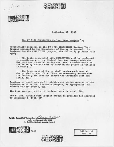 Keywords: The FY 1986 CHARIOTEER Nuclear Test Program - NARA - 198307.tif Scope and content General notes 198307 Local identifier President 1981-1989 Reagan National Security Council 1981 - 1989 Ronald Reagan Library NLRR 40 Presidential Drive Simi Valley CA 93065-0600 1985-09-30 Record group Collection RR-NSC Numbered National Security Policy Papers 1981 - 1989 Record group ARC 1189 National Security Decision Directives compiled 02/25/1981 - 01/19/1989 Series ARC 198166 File unit File unit ARC Variant control numbers NAIL Control Number NLS-NSC-NSDD-190 yes Other versions <gallery> File The_FY_1986_CHARIOTEER_Nuclear_Test_Program_-_NARA_-_198307 tif tif File The_FY_1986_CHARIOTEER_Nuclear_Test_Program_-_NARA_-_198307 jpg jpg </gallery> NARA-cooperation PD-USGov Operation Charioteer Presidential Decision Directives Reagan NARA TIF images with categorized JPGs |