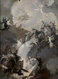 | Keywords: outdoor Franz Anton Maulbertsch (Austrian, Langenargen am Bodensee 1724–1796 Vienna) Date: ca. 1772–73 Medium: Oil on canvas Dimensions: 27 1/2 x 19 7/8 in. (70 x 50.5 cm) This oil sketch is preparatory for a fresco on the ceiling of the nave of the cathedral of Gyor (Raab) in Hungary. In the lower left is Saint Ladislaus I (1040–1095), king of Hungary, while Saint Stephen (975–1038) and his son, Saint Emeric, are shown at the summit of the clouds together with Saint Martin, bishop of Tours. The Trinity appears in the heavens. An artist of enormous facility and imagination, Maulbertsch is the outstanding Austrian exponent of the great tradition of Venetian painting as represented by Piazzetta and Tiepolo. Photo taken at The Met, March 2016. Franz Anton Maulbertsch (Austrian, Langenargen am Bodensee 1724–1796 Vienna) Date: ca. 1772–73 Medium: Oil on canvas Dimensions: 27 1/2 x 19 7/8 in. (70 x 50.5 cm) This oil sketch is preparatory for a fresco on the ceiling of the nave of the cathedral of Gyor (Raab) in Hungary. In the lower left is Saint Ladislaus I (1040–1095), king of Hungary, while Saint Stephen (975–1038) and his son, Saint Emeric, are shown at the summit of the clouds together with Saint Martin, bishop of Tours. The Trinity appears in the heavens. An artist of enormous facility and imagination, Maulbertsch is the outstanding Austrian exponent of the great tradition of Venetian painting as represented by Piazzetta and Tiepolo. Photo taken at The Met, March 2016. Franz Anton Maulbertsch (Austrian, Langenargen am Bodensee 1724–1796 Vienna)