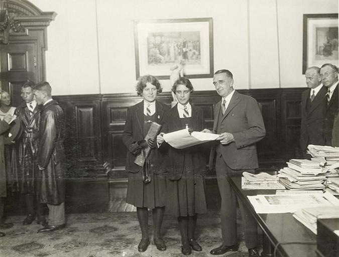 Keywords: archives state records nsw staterecordsnsw newsouthwales blackandwhite goodwill message goodwillmessage people schoolchildren minister office leathercoat monochrome black and white Title: The Goodwill Message at the Education Dept. Winnie Cutler (left) and Beryl Lamble Fort St Girls High School) with Mr Davies, Minister for Education Dated: 17/03/1932 Digital ID: 12685_a007_a00704_8734000153r Rights: www.records.nsw.gov.au/about-us/rights-and-permissions We'd love to hear from you if you use our photos/documents. Many other photos in our collection are available to view and browse on our website using Photo Investigator. Title: The Goodwill Message at the Education Dept. Winnie Cutler (left) and Beryl Lamble Fort St Girls High School) with Mr Davies, Minister for Education Dated: 17/03/1932 Digital ID: 12685_a007_a00704_8734000153r Rights: www.records.nsw.gov.au/about-us/rights-and-permissions We'd love to hear from you if you use our photos/documents. Many other photos in our collection are available to view and browse on our website using Photo Investigator. |