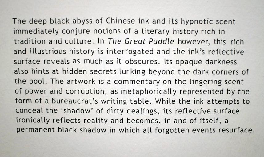 | Keywords: the great puddle by nguyen huy an text document writing blackandwhite black and white The Great Puddle 2009 Chinese ink and plywood The deep black abyss of Chinese ink and its hypnotic scent immediately conjure notions of a literary history rich in tradition and culture. In The Great Puddle however, this rich and illustrious history is interrogated and the ink's reflective surface reveals as much as it obscures. Its opaque darkness also hints at hidden secrets lurking beyond the dark corners of the pool. The artwork is a commentary on the lingering scent of power and corruption, as metaphorically represented by the form of a bureaucrat's writing table. While the ink attempts to conceal the 'shadow' of dirty dealings, its reflective surface ironically reflects reality and becomes, in and of itself, a permanent black shadow in which all forgotten events resurface. www.singaporebiennale.org/artist_nguyen_huy_an.html The Great Puddle 2009 Chinese ink and plywood The deep black abyss of Chinese ink and its hypnotic scent immediately conjure notions of a literary history rich in tradition and culture. In The Great Puddle however, this rich and illustrious history is interrogated and the ink's reflective surface reveals as much as it obscures. Its opaque darkness also hints at hidden secrets lurking beyond the dark corners of the pool. The artwork is a commentary on the lingering scent of power and corruption, as metaphorically represented by the form of a bureaucrat's writing table. While the ink attempts to conceal the 'shadow' of dirty dealings, its reflective surface ironically reflects reality and becomes, in and of itself, a permanent black shadow in which all forgotten events resurface. www.singaporebiennale.org/artist_nguyen_huy_an.html |