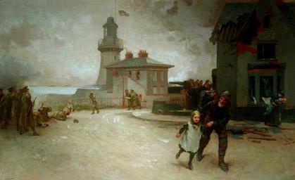 | Keywords: This picture, perhaps the most "topical" in this years (1915) Royal Academy, has been presented to the town of Hartlepool by Mr M. H. Horsley. The artist, Mr James Clark, is the painter of "The Great Sacrifice" The Bombardment of the Hartlepools (16 December 1914), by James Clark (1858-1943), was painted in 1915. This is an oil painting on canvas, measuring 85 x 136 cm, and is a copy of the larger canvas that Clark painted in order to commemorate the unprecedented Bombardment of his original hometown by three warships of the German Navy, when nearly 130 people were killed and hundreds more injured. It is reproduced here by courtesy of Hartlepool Museums and Heritage Service. Commentary by Jacqueline Banerjee. Clark had come to visit the scene of this attack just days after the event, says Charlotte Taylor. Here, it is still in progress. Against the seawall, some of the territorials lie fallen while others, in their khaki greatcoats, are urgently struggling to put up a defence, which was hampered by the position of the lighthouse. People are fleeing. A woman carrying an infant rushes away on the far right, in the shadow of a wrecked seafront building, with the word most of the word "Cafe" visible on the frontage. Some timber lies in the road. But the main focus, apart from the central lighthouse bravely flying its flag, is a fisherman hurrying a little girl from the frightening scene, and, he hopes, from danger. Another person can be seen running behind him on the right. The painting becomes the more poignant, especially with reference to the little girl, when accompanied by the following account: a number of the characters are identifiable. Sarah Ann Stringer is the lady in the background carrying her son Jonathon in a bid for safety; unfortunately, she was hit in the back by a piece of shrapnel, which exited through her stomach and then took off Jonathon’s foot. The boy survived but Sarah died thirteen years later from, it seems, septicaemia caused by her injury. Ethel Stringer is the little girl in the foreground being ushered away by the fisherman; sadly, she too was hit, losing both her legs and dying eleven days later. [Chrystal and Crossley] Clark would have known some of this, but, as with The Great Sacrifice, he does not attempt to show the full ugliness of war. Instead, by focusing on the fisherman's attention to his charge, and the mother's to her infant, he dwells on how the human spirit, at its best, can rise above the immediate predicament in its concern for others. As he had hoped, the painting came to sum up the horrors of the Bombardment and record it for future generations. see artuk.org/discover/artworks/the-bombardment-of-the-hartle... This picture, perhaps the most "topical" in this years (1915) Royal Academy, has been presented to the town of Hartlepool by Mr M. H. Horsley. The artist, Mr James Clark, is the painter of "The Great Sacrifice" The Bombardment of the Hartlepools (16 December 1914), by James Clark (1858-1943), was painted in 1915. This is an oil painting on canvas, measuring 85 x 136 cm, and is a copy of the larger canvas that Clark painted in order to commemorate the unprecedented Bombardment of his original hometown by three warships of the German Navy, when nearly 130 people were killed and hundreds more injured. It is reproduced here by courtesy of Hartlepool Museums and Heritage Service. Commentary by Jacqueline Banerjee. Clark had come to visit the scene of this attack just days after the event, says Charlotte Taylor. Here, it is still in progress. Against the seawall, some of the territorials lie fallen while others, in their khaki greatcoats, are urgently struggling to put up a defence, which was hampered by the position of the lighthouse. People are fleeing. A woman carrying an infant rushes away on the far right, in the shadow of a wrecked seafront building, with the word most of the word "Cafe" visible on the frontage. Some timber lies in the road. But the main focus, apart from the central lighthouse bravely flying its flag, is a fisherman hurrying a little girl from the frightening scene, and, he hopes, from danger. Another person can be seen running behind him on the right. The painting becomes the more poignant, especially with reference to the little girl, when accompanied by the following account: a number of the characters are identifiable. Sarah Ann Stringer is the lady in the background carrying her son Jonathon in a bid for safety; unfortunately, she was hit in the back by a piece of shrapnel, which exited through her stomach and then took off Jonathon’s foot. The boy survived but Sarah died thirteen years later from, it seems, septicaemia caused by her injury. Ethel Stringer is the little girl in the foreground being ushered away by the fisherman; sadly, she too was hit, losing both her legs and dying eleven days later. [Chrystal and Crossley] Clark would have known some of this, but, as with The Great Sacrifice, he does not attempt to show the full ugliness of war. Instead, by focusing on the fisherman's attention to his charge, and the mother's to her infant, he dwells on how the human spirit, at its best, can rise above the immediate predicament in its concern for others. As he had hoped, the painting came to sum up the horrors of the Bombardment and record it for future generations. see artuk.org/discover/artworks/the-bombardment-of-the-hartle... |