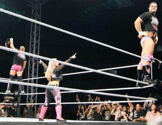 Keywords: The Hart Dynasty.jpg en The Hart Dynasty posing for the crowd own Feedback 2010-09-03 Harry Smith wrestler Natalya Neidhart TJ Wilson Wrestlers as the WWE Tag Team champion