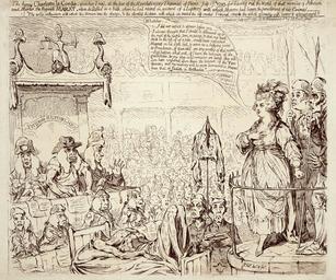 | Keywords: The heroic Charlotte la Cordé, upon her trial, at the bar of the revolutionary tribunal of Paris, July 17, 1793.jpg Print shows Charlotte Corday standing before the judges of the Revolutionary Tribunal with the body of Marat which lying between them She responds to the Tribunal Wretches I did not expect to appear before you - I always thought that I should be delivered up to the rage of the people torn in pieces that my head stuck on the top of a pike would have preceded Marat on his state bed to serve as a rallying point to Frenchmen if there still are any worthy of that name But happen what will if I have the honours of the guillotine my clay-cold remains are buried they will soon have conferred upon them the honours of the Pantheon; and my memory will be more honoured in France than that of Judith in Bethulia Title from item Title continues For having rid the world of that monster of Atheism and Murder the Regicide Marat whom she stabbed in a bath where he had retired on account of a Leprosy with which Heaven had begun the punishment of his Crimes The noble enthusiasm with which this woman met the charge the elevated disdain with which she treated the self-created Tribunal struck the whole assembly with terror astonishment 1 print etching Created/published in London Publish'd by H Humphrey No 18 Old Bond Street 1793 July 29th Library of Congress Prints and Photographs Division Washington D C 20540 USA http //hdl loc gov/loc pnp/ppmsca 05419 Creator James Gillray PD-old-100 Image Corday-Gillray-color jpeg Charlotte Corday Revolutionary Tribunal 1793-1795 1793 in Paris 18th-century people of Paris 1793 cartoons James Gillray Caricatures on the French Revolution 1793 Phrygian caps 17 July Prisoners in art 1793 Gilray Etchings of Paris Images of Paris from the Library of Congress |
