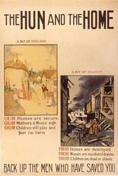 | Keywords: The Hun and the Home.jpg propagande britannique en 1917 « Le Hun et la maison » à la gauche un dessin dépeint un village britannique « A bit of England » dans un lieu paisible ensoleillé à la droite le dessin dépeint un village dévasté en Belgique « A bit of Belgium » Sous le dessin à la gauche trois phrases sont écrites « Nos maisons sont en sécurité Nos mères et épouses sont sauves Nos enfants jouent encore et n'ont aucune crainte du danger » Sous celui à la droite il est écrit « Leurs maisons sont détruites Leur femmes sont mortes ou pire Leurs enfants sont morts ou esclaves » Le message tout en bas de l'affiche est « Donnez votre appui aux hommes qui vous ont sauvé » firstworldwar com http //www firstworldwar com/posters/images/pp_uk_03 jpg image http //www firstworldwar com/posters/uk htm page ~ 1918 David Wilson PD author died in 1934 http //library georgetown edu/dept/speccoll/britpost/posters htm source PD-old World War I posters from the United Kingdom Germans as Hun Anti-German propaganda |