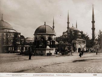 | Keywords: alman çeşmesi almançeşmesi alman i̇mparatoru ii. wilhelm almanimparatoruiiwilhelm kaiser wilhelm ii kaiserwilhelmii ii. wilhelm iiwilhelm ii. abdülhamid iiabdülhamid german fountain germanfountain german emperor germanemperor wilhelm ii wilhelmii abdülhamid ii abdülhamidii çeşme fountain mimari architecture sultanahmet meydanı sultanahmetmeydanı sultanahmet square sultanahmetsquare sultanahmet i̇stanbul istanbul salt araştırma saltaraştırma salt research saltresearch salt online saltonline outdoor monochrome www.archives.saltresearch.org/R/-?func=dbin-jump-full&amp... “Sultanahmet Meydanı’nda, park içinde bir meydan çeşmesidir. Almanya İmparatoru İkinci Wilhelm’in İstanbul’u ikinci ziyaretinde, İkinci Abdülhamid ile mülâkatının hâtırası olarak Almanya Hükümeti tarafından yaptırılmıştır. Açılış merasimi 1 İkincikânun 1901’de yapılmıştır. Her şeyi Almanya’da yapılarak, İstanbul’da temelinin üzerine kurulmuştur. Sekiz köşeli, yedi musluklu, koyu yeşil ve mücellâ sekiz somaki sütun üzerine atılmış, sekiz kemer üstünde bir kubbeden ibaret mermer bir çeşmedir. [...] Tamamen yabancı bir sanat eseri olarak da İstanbul’da bir eşi daha bulunmayan bir çeşmedir.” Kaynak: Reşad Ekrem Koçu, “Gün Işığında Tarih: Alman Çeşmesi”, “Milliyet”, 17.11.1954 www.archives.saltresearch.org/R/-?func=dbin-jump-full&amp... “Sultanahmet Meydanı’nda, park içinde bir meydan çeşmesidir. Almanya İmparatoru İkinci Wilhelm’in İstanbul’u ikinci ziyaretinde, İkinci Abdülhamid ile mülâkatının hâtırası olarak Almanya Hükümeti tarafından yaptırılmıştır. Açılış merasimi 1 İkincikânun 1901’de yapılmıştır. Her şeyi Almanya’da yapılarak, İstanbul’da temelinin üzerine kurulmuştur. Sekiz köşeli, yedi musluklu, koyu yeşil ve mücellâ sekiz somaki sütun üzerine atılmış, sekiz kemer üstünde bir kubbeden ibaret mermer bir çeşmedir. [...] Tamamen yabancı bir sanat eseri olarak da İstanbul’da bir eşi daha bulunmayan bir çeşmedir.” Kaynak: Reşad Ekrem Koçu, “Gün Işığında Tarih: Alman Çeşmesi”, “Milliyet”, 17.11.1954 |