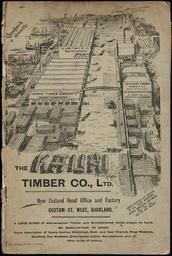 | Keywords: text document writing monochrome drawing sketch Shows a bird's-eye view of the company's premises at Custom Street West, Auckland, with the Joinery and Box Departments at the left, and the head office at the right. The two sections are joined by an overhead walkway. The far left shows sailing ships tied up at the wharves. In the foreground are neat piles of sawn timber, and in the wide corridor between the buildings, horses and carts move with their loads of timber. Quantity: 1 b&w photo-mechanical print(s) on cover of catalogue.. Physical Description: Offset print, on cover 284 x 186 mm. The Kauri Timber Company Ltd (Auckland Office) :[Catalogue. Front cover. ca 1906].. The Kauri Timber Company Ltd (Auckland Office) :[Catalogue. ca 1906].. Ref: Eph-B-BUILDING-SUPPLIES-CA-1906-01-front. Alexander Turnbull Library, Wellington, New Zealand. natlib.govt.nz/records/23202176 Shows a bird's-eye view of the company's premises at Custom Street West, Auckland, with the Joinery and Box Departments at the left, and the head office at the right. The two sections are joined by an overhead walkway. The far left shows sailing ships tied up at the wharves. In the foreground are neat piles of sawn timber, and in the wide corridor between the buildings, horses and carts move with their loads of timber. Quantity: 1 b&w photo-mechanical print(s) on cover of catalogue.. Physical Description: Offset print, on cover 284 x 186 mm. The Kauri Timber Company Ltd (Auckland Office) :[Catalogue. Front cover. ca 1906].. The Kauri Timber Company Ltd (Auckland Office) :[Catalogue. ca 1906].. Ref: Eph-B-BUILDING-SUPPLIES-CA-1906-01-front. Alexander Turnbull Library, Wellington, New Zealand. natlib.govt.nz/records/23202176 |