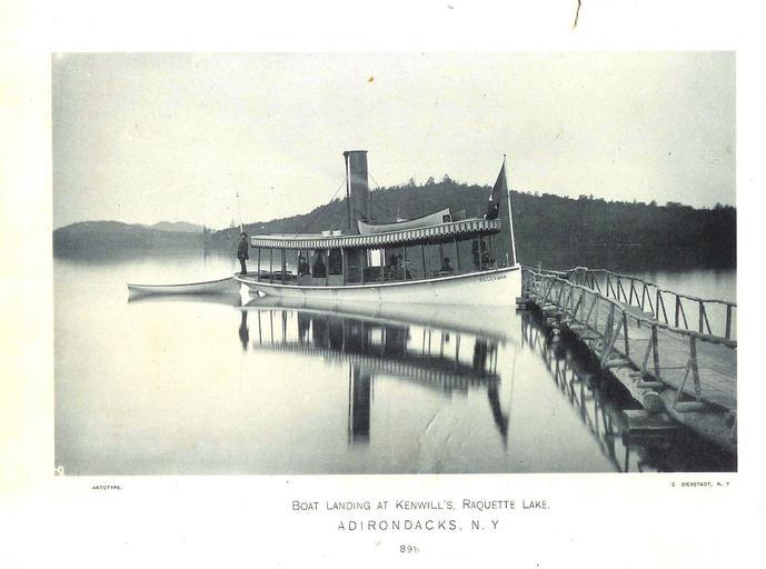 | Keywords: killoquah raquette lake raquettelake adirondacks A Bierstadt photograph from 1885 of the steamer "KILLOQUAH" at the old Kenwell's Landing on the shore of today's Raquette Lake. As folklore has it, this great lake was renamed for a large collection of snowshoes found abandoned on its shoreline. Overtaken by a spring thaw in 1776, an expedition of French Canadian Loyalist Tories, led by Sir John Johnson, left their snowshoes behind. Raquette is the French word for snowshoe. The indigenous Indian tribes had called the great lake "Killoquah". * Photo credit: Church Of The Good Shepard A Bierstadt photograph from 1885 of the steamer "KILLOQUAH" at the old Kenwell's Landing on the shore of today's Raquette Lake. As folklore has it, this great lake was renamed for a large collection of snowshoes found abandoned on its shoreline. Overtaken by a spring thaw in 1776, an expedition of French Canadian Loyalist Tories, led by Sir John Johnson, left their snowshoes behind. Raquette is the French word for snowshoe. The indigenous Indian tribes had called the great lake "Killoquah". * Photo credit: Church Of The Good Shepard |