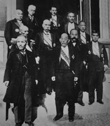 | Keywords: The Kiyoura Cabinet.jpg 清浦内閣発足にあたって恒例の 閣議後の記念撮影:<br />前列左から 水野錬太郎内相 清浦奎吾首相 <br />二列目左端に 上格 海相 右寄りに 前田利定農商相 鈴 三郎法相 <br />三列目左に 江 千之文相 右に 井慶四郎外相 <br />四列目左端に 小 謙次郎鉄相 右端に 藤 義 相 <br />後列左に 小橋 太書記官長 右に 田主計蔵相 Rentarō Mizuno Prime Minister Keigo Kiyoura <br />2nd row l-r Minister of Navy Kakuichi Murakami Minister of Agriculture and Commerce Toshisada Maeda Minister of Justice Kisaburō Suzuki <br />3rd row l-r Minister of Education Kazuyuki Egi Minister of Foreign Affairs Keishirō Matsui <br />4th row l-r Minister of Railways Kenjirō Komatsu Minister of Post and Telecommunication Yoshirō Fujimura <br />Back row l-r Chief Cabinet Secretary Ichita Kobashi Minister of Finance Kazue Shōda http //blogs yahoo co jp/rx7fd3s917/GALLERY/show_image_v2 html id http 3A 2F 2Fblogs c yimg jp 2Fres 2Fblog-21-ee 2Frx7fd3s917 2Ffolder 2F1536828 2F47 2F62942847 2Fimg_9 3F1460959142 i 1 大正十三年 七日 / 7 January 1924 author PD-Japan-oldphoto Group photo-ops of Japanese governments 23-0 Keigo Kiyoura Rentarō Mizuno Kakuichi Murakami Toshisada Maeda Kisaburō Suzuki Egi Kazuyuki Keishirō Matsui Kenjirō Komatsu Yoshirō Fujimura Ichita Kobashi Kazue Shōda |