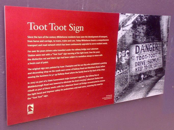 Keywords: The Laburnum Railway Station 'Toot-Toot' sign.jpg en Photo of a plaque commemorating the Laburnum Railway Station 'Toot-Toot' sign 2011-05-31 own Stewart Allen -37 820569 145 141236 cc-zero Uploaded with UploadWizard Laburnum railway station Melbourne |