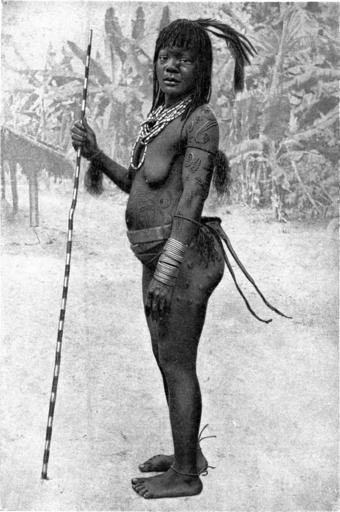 | Keywords: cicatrization scarification portrait black and white blackandwhite blackandwhite monochrome outdoor black and white The hand and knife of an artist are seen in her fine scar patterns; her belt and double tails are the latest thing in totem ornament, and she has spent two days in getting her woolly hair into permanent plaits. They are now solidified with palm oil and camwood dust, and she means them to last, without re-dressing, for at least three months Photo, Mrs. J. H. Harris The hand and knife of an artist are seen in her fine scar patterns; her belt and double tails are the latest thing in totem ornament, and she has spent two days in getting her woolly hair into permanent plaits. They are now solidified with palm oil and camwood dust, and she means them to last, without re-dressing, for at least three months Photo, Mrs. J. H. Harris |