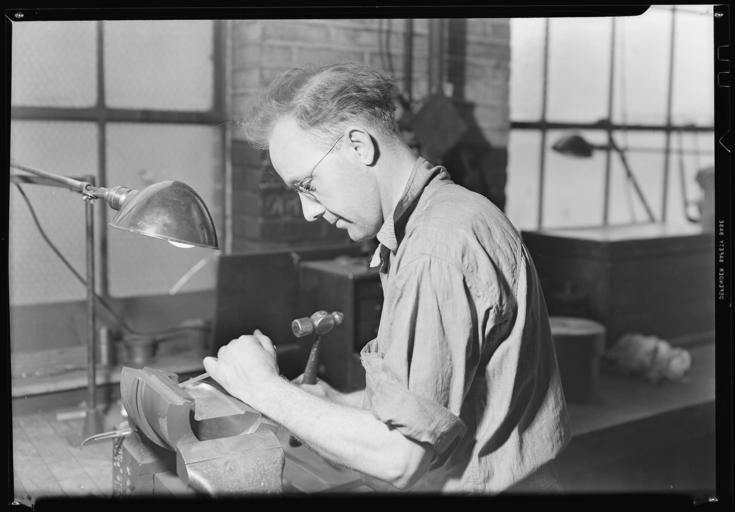 | Keywords: nara:arcid=518656 u.s. national archives usnationalarchives lewis hine lewishine millville new jersey newjersey the great depression thegreatdepression 1937 blackandwhite monochrome photo border black and white Original Caption: Millville, New Jersey - Glass bottles. The letterer in the Whitall Tatum mould shop. This man is chiseling out by hand letters in the mould of a bottle. He works according to a design which has been drawn in the mould in pencil, March 1937 U.S. National Archives’ Local Identifier: 69-RP-426 Photographer: Hine, Lewis Subjects: The New Deal Tennessee Valley Authority Works Progress Administration Work Portraits The Great Depression Persistent URL: research.archives.gov/description/518656 Repository: Still Picture Records Section, Special Media Archives Services Division (NWCS-S), National Archives at College Park, 8601 Adelphi Road, College Park, MD, 20740-6001. For information about ordering reproductions of photographs held by the Still Picture Unit, visit: www.archives.gov/research/order/still-pictures.html Reproductions may be ordered via an independent vendor. NARA maintains a list of vendors at www.archives.gov/research/order/vendors-photos-maps-dc.html Access Restrictions: Unrestricted Use Restrictions: Unrestricted Original Caption: Millville, New Jersey - Glass bottles. The letterer in the Whitall Tatum mould shop. This man is chiseling out by hand letters in the mould of a bottle. He works according to a design which has been drawn in the mould in pencil, March 1937 U.S. National Archives’ Local Identifier: 69-RP-426 Photographer: Hine, Lewis Subjects: The New Deal Tennessee Valley Authority Works Progress Administration Work Portraits The Great Depression Persistent URL: research.archives.gov/description/518656 Repository: Still Picture Records Section, Special Media Archives Services Division (NWCS-S), National Archives at College Park, 8601 Adelphi Road, College Park, MD, 20740-6001. For information about ordering reproductions of photographs held by the Still Picture Unit, visit: www.archives.gov/research/order/still-pictures.html Reproductions may be ordered via an independent vendor. NARA maintains a list of vendors at www.archives.gov/research/order/vendors-photos-maps-dc.html Access Restrictions: Unrestricted Use Restrictions: Unrestricted |