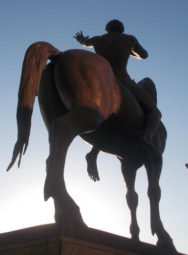 | Keywords: sutton surrey sutton, surrey suttonsurrey sutton, london suttonlondon sculpture sir david wynne sirdavidwynne london london borough of sutton londonboroughofsutton reed the quadrant thequadrant horse horse and rider horseandrider 1981 art statue public art publicart outdoor See Wikipedia article:   The Messenger is a statue by the English sculptor David Wynne, OBE of a horse and rider. It was installed in the town centre of Sutton in Greater London, England in 1981.  Features:  The statue features a horse and rider, created in bronze with very dark patination. It is located directly outside the main entrance to Quadrant House (in the Quadrant), adjacent to Sutton railway station. The horse, with a slightly raised left leg, looks towards the station. The rider, seated bareback, raises his left hand in the air above his head and his right hand to his mouth, as if calling out. It is fully life-size and mounted on a 7 foot plinth of marble and granite slabs. The total height is 150 inches.  Commissioning and the brief:  The statue was commissioned by the then Business Press International Ltd, and upkeep of the work now falls to Reed Business Information, who occupy Quadrant House.  It was a major commission for Wynne, which took four years from his first idea and inspiration on receipt of the brief through roughing out, refining and foundry to the final unveiling and installation. The brief given to him by the company was to illustrate the fundamental business of the company, namely communication, but to convey the idea, rather than simply to represent the work of the company in a direct or very obvious way.  Location:  The company had initially considered that the work should be installed high up, above the entrance lobby. However, Wynne advised against this, feeling that the distance created would militate against the engagement he wanted people to have with the work. It would be perceived as two-dimensional, depriving people of the full three-dimensions they would feel by walking around it. So the statue was installed at ground level in front of the entrance to the building, enabling people to get close up to it.  Moment of inspiration:  Having agreed the overall idea that the work was to convey, Wynne had to consider what actual form the sculpture would take to best capture the idea of communication. When inspiration came to him, it did so "like a flash of light, complete", as he put it:  "A tall wise horse that had never known a bridle, a magic horse if you like, poised, one foot pointing to the centre of the earth; head up, nostrils flared, about to whip round and plunge away. On his back a carefree boy, wild as the horse, calling out to his friends, who have forgotten that they too are heirs to his kingdom."  Preparation:  As part of his preparation, Wynne visited Italy to see the Equestrian Statue of Marcus Aurelius in Rome and the Horses of Saint Mark in Venice.  Unveiling:  Describing his thoughts moments before the unveiling, David Wynne wrote in his 1982 book The Messenger.  "It is a proud moment for the sculptor when he sees a crowd of expectant and rather puzzled people gazing at an ungainly shrouded shape in the most prominent position outside a gleaming new building. Will they be surprised, pleased, disappointed or even appalled when the cover comes off? Too late to change it now!"  Wynne's idea of the relationship between the horse and man:  In his introductory essay in the book The Messenger, Lucius Noël notes Wynne's dislike for statues where the horse is shown as merely the support for the rider. Noël notes the way that Wynne highlights the interrelationship between horse and rider in the work, as he did in his previous two horse and rider sculptures. While noting the greater reality in the work than its two equestrian predecessors, he stresses the strong symbolism in the work. He writes:  "The rider, a young man, is giving his message to his audience, and seems to be saying that there is another world that all should know about. But the horse is just as important as the man. His is, in fact, more concious than the man, and has his feet firmly planted on the ground, one hoof pointing to the centre of the earth. They are a team, and the overall impression is that each needs the other: man needs the horse, as much as the horse needs man."  Noël notes how this analysis ties in with Wynne's wider views about animals:  "We must share the Earth with the animals, who have as much right to it as we do. To find a way to live in peace with the animals is our duty."  See Wikipedia article:   The Messenger is a statue by the English sculptor David Wynne, OBE of a horse and rider. It was installed in the town centre of Sutton in Greater London, England in 1981.  Features:  The statue features a horse and rider, created in bronze with very dark patination. It is located directly outside the main entrance to Quadrant House (in the Quadrant), adjacent to Sutton railway station. The horse, with a slightly raised left leg, looks towards the station. The rider, seated bareback, raises his left hand in the air above his head and his right hand to his mouth, as if calling out. It is fully life-size and mounted on a 7 foot plinth of marble and granite slabs. The total height is 150 inches.  Commissioning and the brief:  The statue was commissioned by the then Business Press International Ltd, and upkeep of the work now falls to Reed Business Information, who occupy Quadrant House.  It was a major commission for Wynne, which took four years from his first idea and inspiration on receipt of the brief through roughing out, refining and foundry to the final unveiling and installation. The brief given to him by the company was to illustrate the fundamental business of the company, namely communication, but to convey the idea, rather than simply to represent the work of the company in a direct or very obvious way.  Location:  The company had initially considered that the work should b