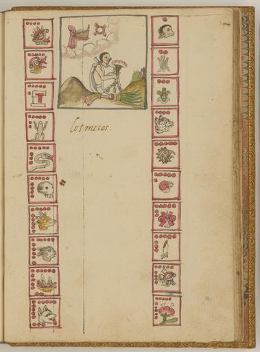 | Keywords: The Months of the Aztec Tonalpohualli (Day Count) Calendar WDL6733.png Artwork ru Това Хуан де около 1546 г около 1626 г fr Tovar Jean de 1546-1626 env en Tovar Juan de circa 1546-circa 1626 zh 胡安·德·托瓦尔,约 1546 年 - 约 1626 年 pt Tovar Juan de por volta de 1546-por volta de 1626 ar خوان دو توفار، حوالي 1546-حوالي 1626 es Tovar Juan de circa 1546-circa 1626 ru есяцы ацтекского календа я тональпоуалли счет дней fr Les mois du calendrier Tonalpohualli nombre de jours aztèque en The Months of the Aztec Tonalpohualli Day Count Calendar zh 阿兹特克神 历的 份 pt Os meses do calendário asteca Tonalpohualli contagem dos dias ar شهور تقويم التونالبوالي عد الأيام الخاص بالأزتك ru Кодекс Това а авто ом кото ого считается мексиканский иезуит XVI века Хуан де Това соде жит под обную инфо мацию об об ядах и це емониях ацтеков известных также как мешика Кодекс п оиллюст и ован 51 аква ельным исунком на полную ст аницу Рисунки в кото ых наблюдается значительное влияние пиктог афических укописей доколониальных в емен обладают исключительными художественными достоинствами Рукопись состоит из т ех азделов В пе вом азделе описана исто ия путешествий ацтеков до п ибытия испанцев Вто ой аздел п едставляет собой иллюст и ованную исто ию ацтеков В т етьем азделе находится календа ь Това а в кото ом п ослеживается календа ный цикл ацтеков с месяцами неделями днями воск есными буквами и елигиозными п аздниками х истианского 365-дневного года а этой иллюст ации из т етьего аздела п едставлен один месяц ацтеков с указанием названия каждого дня месяца В ве хней части исунка изоб ажены ж ец с плюмажем из пе ьев птицы кетцаль у ног и в ко оне а также колесо календа я на заднем плане Ацтеки использовали два календа я для исчисления дней в году Шиупоуалли пе вый или солнечный календа ь состоял из 365 дней азделенных на 18 месяцев по 20 дней в каждом плюс дополнительные пять пустых дней в конце года Тональпоуалли вто ой календа ь счет дней состоял из 260 дней кото ые п едставляли собой сочетание 13 чисел и 20 символов Циклы обоих календа ей совпадали аз в 52 года Ве оятно на иллюст ации изоб ажен седьмой месяц текуилуитонтли маленький пи господ <br>Календа ь ацтеков; Ацтеки; Календа и; Кодекс; Индейцы ексики; Ко енные на одности; езоаме ика; Кодекс Това а fr Le codex Tovar attribué à Jean de Tovar jésuite mexicain du XVI<sup>e</sup> siècle contient des informations détaillées sur les rites et les cérémonies des Aztèques également connus sous le nom de Mexicas Il est illustré de 51 aquarelles de la taille d'une page Fortement influencées par les manuscrits pictographiques de la période précontact ces peintures sont d'une qualité artistique exceptionnelle Le manuscrit est divisé en trois sections La première section contient une histoire des voyages des Aztèques avant l'arrivée des Espagnols La deuxième section est une histoire illustrée des Aztèques Dans la troisième section le calendrier de Tovar transcrit un calendrier aztèque continu avec les mois les semaines les jours les lettres dominicales et les fêtes liturgiques d'une année chrétienne de 365 jours Cette illustration extraite de la troisième section montre un mois aztèque indiquant le nom de chacun de ses jours La partie supérieure contient l'image d'un prêtre avec un panache de plumes de quetzal à ses pieds ainsi qu'une couronne et une roue de calendrier en arrière-plan Les Aztèques utilisaient deux calendriers pour calculer les jours de l'année Comportant 365 jours Xiuhpohualli premier calendrier également appelé solaire était divisé en 18 mois de 20 jours chacun plus une période supplémentaire de cinq jours épagomènes à la fin de l'année Tonalpohualli second calendrier également appelé « nombre de jours » était constitué de 260 jours combinant 13 nombres et 20 symboles Tous les 52 ans ces deux calendriers concordaient L'image illustre probablement le septième mois Tecuilhuitontli petite fête des dignitaires <br>Calendrier aztèque; Aztèques; Calendriers; Codex; Indiens du Mexique; Peuples autochtones; Méso-Amérique; Codex Tovar en The Tovar Codex attributed to the 16th-century Mexican Jesuit Juan de Tovar contains detailed information about the rites and ceremonies of the Aztecs also known as Mexica The codex is illustrated with 51 full-page paintings in watercolor Strongly influenced by pre-contact pictographic manuscripts the paintings are of exceptional artistic quality The manuscript is divided into three sections The first section is a history of the travels of the Aztecs prior to the arri