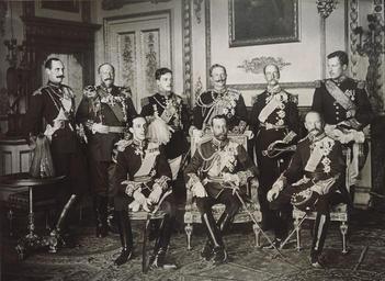 | Keywords: The Nine Sovereigns at Windsor for the funeral of King Edward VII.jpg en The Nine Sovereigns at Windsor for the funeral of King Edward VII Standing from left to right King Haakon VII of Norway Tsar Ferdinand of Bulgaria King Manuel II of Portugal Kaiser Wilhelm II of the German Empire King George I of Greece and King Albert I of Belgium Seated from left to right King Alfonso XIII of Spain King-Emperor George V of the United Kingdom and King Frederick VIII of Denmark 1910-05-20 Scanned from the book Crown Camera Published by Penguin Books 1987 © Photographed by W D Downey PD-old Nine Sovereigns at Windsor for the funeral of King Edward VII ImageNote 1 59 94 80 106 750 557 2 HM Haakon VII King of Norway ImageNoteEnd 1 ImageNote 2 165 98 76 104 750 557 2 HM Ferdinand I King of Bulgaria ImageNoteEnd 2 ImageNote 3 231 213 74 101 750 557 2 HM Alfonso XIII King of Spain ImageNoteEnd 3 ImageNote 4 282 108 74 100 750 557 2 HM Manuel II King of Portugal ImageNoteEnd 4 ImageNote 5 391 105 73 105 750 557 2 HIM Wilhelm II German Emperor ImageNoteEnd 5 ImageNote 6 396 215 70 94 750 557 2 HIM George V King-Emperor of Great-Brittain ImageNoteEnd 6 ImageNote 7 498 109 74 98 750 557 2 HM George I King of the Hellenes ImageNoteEnd 7 ImageNote 8 582 203 81 115 750 557 2 HM Frederik VIII King of Denemark ImageNoteEnd 8 ImageNote 9 623 86 86 111 750 557 2 HM Albert I King of the Belgians ImageNoteEnd 9 ImageNote 10 154 223 124 118 1500 1094 2 Haakon VII of Norway ImageNoteEnd 10 ImageNote 11 351 233 131 126 1500 1094 2 Ferdinand I of Bulgaria ImageNoteEnd 11 ImageNote 12 578 261 135 118 1500 1094 2 Manuel II of Portugal ImageNoteEnd 12 ImageNote 13 788 244 133 122 1500 1094 2 William II of Germany ImageNoteEnd 13 ImageNote 14 998 244 137 114 1500 1094 2 George I of Greece ImageNoteEnd 14 ImageNote 15 1232 197 154 128 1500 1094 2 Albert I of Belgium ImageNoteEnd 15 ImageNote 16 474 435 148 128 1500 1094 2 Alfonso XIII of Spain ImageNoteEnd 16 ImageNote 17 780 437 154 137 1500 1094 2 George V of the United Kingdom ImageNoteEnd 17 ImageNote 18 1161 413 135 135 1500 1094 2 Frederick VIII of Denmark ImageNoteEnd 18 |