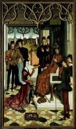 | Keywords: The Ordeal by Fire by Dierec Bouts the Older.jpg Die Probe des glühenden Eisens vor Kaiser Otto III ein Tafelbild von Dirk Bouts gemalt 1470/75 Musée Royal des Beaux-Arts Brüssel Das Bild zeigt eine sagenhafte à berlieferung um Otto III 980 ” 1002 Ein Mann soll mit der Frau Ottos die Ehe gebrochen haben weshalb ihn der Herrscher enthaupten ließ Die Witwe bewies das Gegenteil in der einen Hand hielt sie das abgetrennte Haupt ihres Mannes in der anderen ein glühendes Eisen <p>Notice Saint Richardis is not the woman before Otto but the nun in flames in the far back </p> Próba rozpalonego żelaza przed cesarzem Ottonem III obraz Dirka Boutsa namalowany 1470/75 Musée Royal des Beaux-Arts Bruksela Obraz ilustruje legendarne podanie sic zwiÄ…zane z Ottonem III 980 “1002 Mężczyzna powinien byÅ‚ zerwać zwiÄ…zek małżeÅ„ski z żonÄ… Ottona za co wÅ‚adca skazaÅ‚ go na Å›ciÄ™cie gÅ‚owy Wdowa udowodniÅ‚a stanowisko przeciwne w jednej dÅ‚oni trzymaÅ‚a Å›ciÄ™tÄ… gÅ‚owÄ™ swojego męża a w drugiej “ rozpalone żelazo Próba wiernego przetÅ‚umaczenia powyższego niemieckiego opisu <p>Zakonnica w pÅ‚omieniach daleko z tyÅ‚u to Å›wiÄ™ta Ryszarda </p> Scan aus Peter Dinzelbacher ” Das fremde Mittelalter Gottesurteil und Tierprozess Essen Magnus Verlag 2006 Eine der Bildtafeln zwischen S 128 u 129 ISBN 978-3-88400-504-0 Erläuterung ebenda S 77 1470/75 Dirk Bouts PD-old-100 File Dirk Bouts - Justice of Emperor Otto III- Beheading of the Innocent Count and Ordeal by Fire - Google Art Project jpg<br> Saint Richardis fragment of The Ordeal by Fire by Dierec Bouts the Older jpg Creator Dieric Bouts ImageNote 1 540 1448 157 116 1131 1927 2 Dog ImageNoteEnd 1 Ordeal Corpses in art 15th-century fashion Justice panels right panel Cut-off heads in art Sleeping dogs People with dogs in art Poulaine Otto III Holy Roman Emperor |