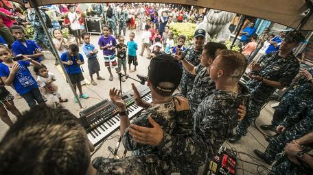 | Keywords: The Pacific Fleet Band performs in Suvasuva, Fiji during Pacific Partnership 2015 150613-N-TQ272-892.jpg en SAVUSAVU Fiji June 13 2015 Capt Christopher Engdahl Pacific Partnership 2015 mission commander joins the Pacific Fleet Band to say thank you to a crowd during Pacific Partnership 2015 Local Fijian poured baby powder on service members to help keep them cool in the heat and sun The hospital ship USNS Mercy T-AH 19 is currently in Savusavu Fiji for its first mission port of PP15 Pacific Partnership is in its 10th iteration and is the largest annual multilateral humanitarian assistance and disaster relief preparedness mission conducted in the Indo-Asia-Pacific region While training for crisis conditions Pacific Partnership missions to date have provided real world medical care to approximately 270 000 patients and veterinary services to more than 38 999 animals Additionally the mission has provided critical infrastructure development to host nations through more than 180 engineering projects U S Navy photo by Mass Communication Specialist 2nd Class Mark El-Rayes/RELEASED 2015-06-10 Petty Officer 2nd Class Mark El-Rayes https //www dvidshub net/image/1999843 150613-N-TQ272-892 2015-06-14 23 38 SAVUSAVU FJ PD-USGov-Military-Navy USNS Mercy T-AH-19 Pacific Partnership 2015 Pacific Fleet Band Images from DoD uploaded by Fæ |