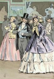 | Keywords: The picture exhibition at the Salon. Looking at Manet's 'Olympia'.jpg Artwork This plate depicts a scene at the Salon of 1865 Manet's painting 'Olympia'is represented in the background on the right of the plate The man in the foreground is wearing a black suit with a starched collar and a blue vest as well as a top hat The woman in the foreground wears a wide flounced dress with a wide crinoline that extends behind her She is also wearing a violet fitted coat and a yellow bonnet tied under the chin with a ribbon Abstract sources Boucher François 20 000 Years of Fashion New York Harry N Abrams Inc 1967 Ruppert Jacques Le Costume Français Paris Flammarion 1996 1898 colored plate 10 x 15 cm Institution Brown University Library object history exhibition history credit line Published in Octave Uzanne Fashion in Paris the various phases of feminine taste and aesthetics from 1797 to 1897 London William Heinemann 1898 accession number 115046831698193 PD-old Les modes de Paris 074 Fashion plates depicting men Images of Paris from the Brown University Library Salon of 1865 Fashion in 1865 Works after Olympia by Manet Salon de peinture et de sculpture |
