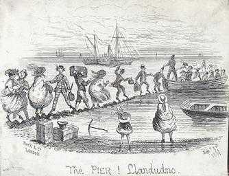| Keywords: The Pier! Llandudno.jpeg Abstract A view showing sartoon-like figures boarding a boat to take them to a paddle steamer The well dressed people are trying to keep their clothes out of the water Size mm 85 107 exhibition history Institution National Library of Wales Technique print engraving bw object history object type PD-old-70-1923 place of creation place of discovery 1130425 The Pier Llandudno Uploaded with GWToolset The Pier Llandudno http //dams llgc org uk/behaviour/llgc-id 1130425/fedora-bdef image/reference Images uploaded as part of NLW - WMUK collaboration Welsh Landscape Collection Llandudno Beaches People Steamboats |