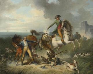 | Keywords: The Prince of Nassau and the Chevalier d'Oraison fighting a jaguar.jpg Artwork en The Prince of Nassau and the Chevalier d'Oraison fighting a jaguar on the coast of Argentina oil on canvas Size cm 32 40 5 object history exhibition history New York Wildenstein Co The Winds of Revolution 14 November 1989 - 19 January 1990 cat no 79 as ascribed to Francesco Casanova credit line place of creation PD-old-100 http //www sothebys com/en/auctions/ecatalogue/2014/old-master-paintings-n09161/lot 51 html accession number Uploaded with UploadWizard Jean Baptiste Le Paon |