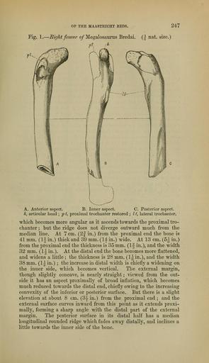 Keywords: The Quarterly journal of the Geological Society of London (13204822563).jpg OP THE MAASTRICHT BEDS <br> 247 <br> Eig 1 Right femur of Megalosaurus Bredai nat size <br> it k <br> l y/jL <br> A Anterior aspect B Inner aspect C Posterior aspect <br> h articular head ; p t proximal trochanter restored ; 1 1 lateral trochanter <br> which becomes more angular as it ascends towards the proximal tro- <br> chanter ; but the ridge does not diverge outward much from the <br> median line At 7 cm 2 in from the proximal end the bone is <br> 41 mm If in thick and 39 mm If in wide At 13 cm 5 J in <br> from the proximal end the thickness is 35 mm 1- in and the width <br> 32 mm 1 in At the distal end the bone becomes more flattened <br> and widens a little ; the thickness is 28 mm l in and the width <br> 38 mm 1 in ; the increase iu distal width is chiefly a widening on <br> the inner side which becomes vertical The external margin <br> though slightly concave is nearly straight ; viewed from the out- <br> side it has an aspect proximally of broad inflation which becomes <br> much reduced towards the distal end chiefly owing to the increasing <br> convexity of the inferior or posterior surface But there is a slight <br> elevation at about 8 cm 3 in from the proximal end; and the <br> external surface curves inward from this point as it extends proxi- <br> mally forming a sharp angle with the distal part of the external <br> margin The posterior surface in its distal half has a median <br> longitudinal rounded ridge which fades away distally and inclines a <br> little towards the inner side of the bone 36928844 113681 51125 Page 247 Text 39 http //www biodiversitylibrary org/page/36928844 1883 Geological Society of London NameFound Megalosaurus NameConfirmed Megalosaurus EOLID 13154127 NameBankID 4234935 Biodiversity Heritage Library The Quarterly journal of the Geological Society of London v 39 1883 Geology Periodicals Smithsonian Libraries bhl page 36928844 dc identifier http //biodiversitylibrary org/page/36928844 smithsonian libraries Information field Flickr posted date ISOdate 2014-03-16 Check categories 2015 August 26 CC-BY-2 0 BioDivLibrary https //flickr com/photos/61021753 N02/13204822563 2015-08-26 13 51 24 cc-by-2 0 PD-old-70-1923 The Quarterly journal of the Geological Society of London 1883 Photos uploaded from Flickr by FĂŚ using a script |