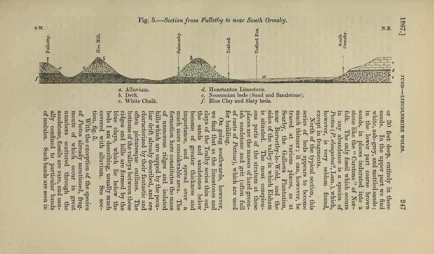 | Keywords: The Quarterly journal of the Geological Society of London (13071107643).jpg 1867 <br> JrDD LIXCOLXSHTRE WOLDS <br> 24i <br> \m <br> 5i <br> s <br> ¢na J pjoj ax <br> T-ioj X <br> ¢jCqnotcqBg - <br> ¢lUH eoH <br> IK <br> – q iFj <br> – - <br> fl s ® <br> 5 o 3 <br> ' –ºO to <br> or 30 feet deep entirely in these <br> sands In the upper part we find <br> white ash-grey and mottled sands ; <br> in the lower part coarse brown <br> sands in places indurated into a <br> stone like the Carstone of IsTor- <br> folk The only fossil which occurs <br> in any abundance is a species of <br> Fecfen P ehngatus Lam which <br> however is very seldom found <br> except in fragments <br> N'orth of the typical section this <br> series of beds appears to become <br> much thinner ; it can however be <br> traced at various places as at <br> Searby the Gallows Plantation <br> near Barnetby-le-Wold and the <br> sides of the valley in which Elsham <br> is situated The most conspicu- <br> ous parts of the stratum at these <br> places are the masses of hard green- <br> ish sandstone and grit often full <br> of casts of Pectens which are used <br> for building <br> On going southwards however <br> we find that as the Kmestones and <br> clays of the Tealby series thin out <br> the sands and sandstones below <br> become of greater thickness and <br> importance and spread over a <br> much more considerable area The <br> formation here constitutes the mass <br> of numerous ridges and isolated <br> hills which are capped by the pecu- <br> liar drift already described and are <br> characterized by their fantastic and <br> often picturesque outlines The <br> bottoms of the valleys between these <br> ridges and hills are formed by the <br> blue clays which lie below the <br> beds I am describing usually much <br> covered with alluvium See sec- <br> tion fig 5 <br> With the exception of the species <br> of Pecten already mentioned frag- <br> ments of which occur in great <br> numbers scattered through the <br> sandstone fossils are rare and usu- <br> ally confined to particular bands <br> of nodules Such bands are seen in 36344996 112028 51125 Page 247 Text v 23 http //www biodiversitylibrary org/page/36344996 1867 Geological Society of London NameFound P ehngatus NameFound Pecten NameConfirmed Pecten EOLID 10719936 NameBankID 2692292 Biodiversity Heritage Library The Quarterly journal of the Geological Society of London v 23 1867 Geology Periodicals Smithsonian Libraries bhl page 36344996 dc identifier http //biodiversitylibrary org/page/36344996 smithsonian libraries Information field Flickr posted date ISOdate 2014-03-10 Check categories 2015 August 26 CC-BY-2 0 BioDivLibrary https //flickr com/photos/61021753 N02/13071107643 2015-08-26 14 52 30 cc-by-2 0 PD-old-70-1923 The Quarterly journal of the Geological Society of London 1867 The Quarterly journal of the Geological Society of London 1867 Photos uploaded from Flickr by Fæ using a script |