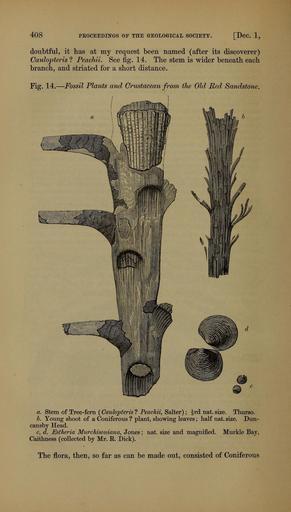 | Keywords: The Quarterly journal of the Geological Society of London (12981449664).jpg 408 <br> PEOCEEDINGS OF THE GEOLOeiCAL SOCIETY DcC 1 <br> doubtful it has at my request been named after its discoverer <br> Caulopteris Peachii See fig 14 The stem is wider beneath each <br> branch and striated for a short distance <br> Fig 14 ” Fossil Plants and Crustacean from the Old Red Sandstone <br> a Stem of Tree-fern Caulopteris Peachii Salter ; Jrd nat size Thurso <br> b Young shoot of a Coniferous plant showing leaves; half nat size Dun- <br> cansby Head <br> c d Estheria Murchisoniana Jones ; nat size and magnified Murkle Bay <br> Caithness collected by Mr R Dick <br> The flora then so far as can be made out consisted of Coniferous 36161965 111474 51125 Page 408 Text v 15 http //www biodiversitylibrary org/page/36161965 1859 Geological Society of London NameFound Caulopteris NameConfirmed Caulopteris NameBankID 4893847 NameFound Estheria NameConfirmed Estheria EOLID 78643 NameBankID 4162149 NameFound Murchisoniana Biodiversity Heritage Library The Quarterly journal of the Geological Society of London v 15 1859 Geology Periodicals Smithsonian Libraries bhl page 36161965 dc identifier http //biodiversitylibrary org/page/36161965 smithsonian libraries Information field Flickr posted date ISOdate 2014-03-07 Check categories 2015 August 26 CC-BY-2 0 BioDivLibrary https //flickr com/photos/61021753 N02/12981449664 2015-08-26 14 55 37 cc-by-2 0 PD-old-70-1923 The Quarterly journal of the Geological Society of London 1859 Photos uploaded from Flickr by Fæ using a script |