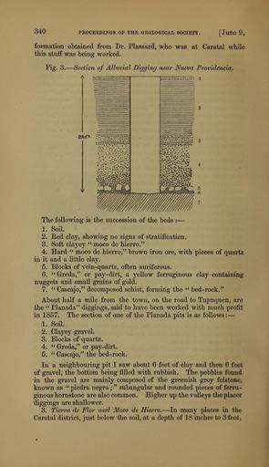 | Keywords: The Quarterly journal of the Geological Society of London (12961211695).jpg 340 <br> PEOCEEDINGS OF THE GEOLOGICAL SOCIETY JuDO 9 <br> formation obtained from Dr Plassard who was at Caratal while <br> this stuff was being worked <br> Fig 3 /Section of Alluvial Digging near Nueva Providencia <br> 24-ft - <br> The following is the succession of the beds <br> 1 Soil <br> 2 Red clay showing no signs of stratification <br> 3 Soft clayey moco de hierro <br> 4 Hard moco de hierro brown iron ore with pieces of quartz <br> in it and a httle clay <br> 5 Blocks of vein-quartz often auriferous <br> 6 Greda or pay-dirt a yellow ferruginons clay containing <br> nuggets and small grains of gold <br> 7 Cascajo decomposed schist forming the bed-rock <br> About half a mile from the town on the road to Tupuquen are <br> the Planada diggings said to have been worked with much profit <br> in 1857 The section of one of the Planada pits is as follows <br> 1 Soil <br> 2 Clayey gravel <br> 3 Blocks of quartz <br> 4 Greda or pay-dirt <br> 5 Cascajo the bed-rock <br> In a neighbouring pit I saw about 6 feet of clay and then 6 feet <br> of gravel the bottom being filled with rubbish The pebbles found <br> in the gravel are mainly composed of the greenish grey felstone <br> known as piedra negra ; subangular and rounded pieces of ferru- <br> ginons hornstone are also common Higher up the valleys the placer <br> diggings are shallower <br> 3 Tierra de Flor and Moco de Hierro In many places in the <br> Caratal district just below the soil at a depth of 18 inches to 3 feet 36103201 111288 51125 Page 340 Text v 25 http //www biodiversitylibrary org/page/36103201 1869 Geological Society of London NameFound Providencia NameConfirmed Providencia EOLID 97438 NameBankID 2557960 Biodiversity Heritage Library The Quarterly journal of the Geological Society of London v 25 1869 Geology Periodicals Smithsonian Libraries bhl page 36103201 dc identifier http //biodiversitylibrary org/page/36103201 smithsonian libraries Information field Flickr posted date ISOdate 2014-03-06 Check categories 2015 August 26 CC-BY-2 0 BioDivLibrary https //flickr com/photos/61021753 N02/12961211695 2015-08-26 15 55 03 cc-by-2 0 PD-old-70-1923 The Quarterly journal of the Geological Society of London 1869 Photos uploaded from Flickr by FĂŚ using a script |