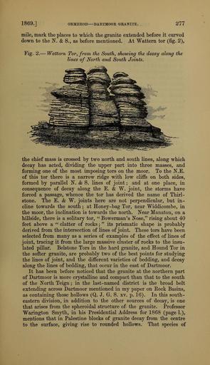 | Keywords: The Quarterly journal of the Geological Society of London (12961600944).jpg 1869 ORiLEROD DAETMOOK GRANITE 277 <br> mile mark the places to which the granite extended before it curved <br> down to the N S as before mentioned At Wattern tor fig 2 <br> Fig 2 Wattern Tor from the South showing the decay along the <br> lines of North and South Joints <br> the chief mass is crossed by two north and south lines along which <br> decay has acted dividing the upper part into three masses and <br> forming one of the most imposing tors on the moor To the N E <br> of this tor there is a narrow ridge with low cliffs on both sides <br> formed by parallel N S lines of joint ; and at one place in <br> consequence of decay along the E W joint the storms have <br> forced a passage whence the tor has derived the name of Thirl- <br> stone The E W joints here are not perpendicular but in- <br> cline towards the south ; at Honey-bag Tor near Widdicombe in <br> the moor the inclination is towards the north Near Manaton on a <br> hillside there is a solitary tor Bowerman's Nose rising about 40 <br> feet above a clatter of rocks ; its prismatic shape is probably <br> derived from the intersection of lines of joint These tors have been <br> selected from many as a series of examples of the effect of lines of <br> joint tracing it from the large massive cluster of rocks to the insu- <br> lated pillar Belstone Tors in the hard granite and Hound Tor in <br> the softer granite are probably two of the best points for studying <br> the hues of joint and the different varieties of bedding and decay <br> along the lines of bedding that occur in the east of Dartmoor <br> It has been before noticed that the granite at the northern part <br> of Dartmoor is more crystalline and compact than that to the south <br> of the North Teign ; in the last-named district is the broad belt <br> extending across Dartmoor mentioned in my paper on Rock Basins <br> as containing those hollows Q J G S xv p 16 In this south- <br> eastern division in addition to the other sources of decay is one <br> that arises from the spheroidal structure of the granite Professor <br> Warington Smyth in his Presidential Address for 1868 page 1 <br> mentions that in Palestine blocks of granite decay from the centre <br> to the surface giving rise to rounded hollows That species of 36103124 111288 51125 Page 277 Text v 25 http //www biodiversitylibrary org/page/36103124 1869 Geological Society of London NameFound S xv Biodiversity Heritage Library The Quarterly journal of the Geological Society of London v 25 1869 Geology Periodicals Smithsonian Libraries bhl page 36103124 dc identifier http //biodiversitylibrary org/page/36103124 smithsonian libraries Information field Flickr posted date ISOdate 2014-03-06 Check categories 2015 August 26 CC-BY-2 0 BioDivLibrary https //flickr com/photos/61021753 N02/12961600944 2015-08-26 15 53 46 cc-by-2 0 PD-old-70-1923 The Quarterly journal of the Geological Society of London 1869 Photos uploaded from Flickr by FĂŚ using a script |