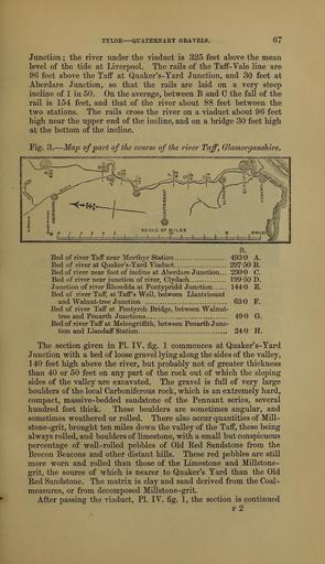 Keywords: The Quarterly journal of the Geological Society of London (12961165723).jpg TYLOR QUATERNARY GRAVELS <br> 67 <br> Junction ; the river under the viaduct is 325 feet above the mean <br> level of the tide at Liverpool The rails of the Taif-Yale line are <br> 96 feet above the Taff at Quaker's- Yard Junction and 30 feet at <br> Aberdare Junction so that the rails are laid on a very steep <br> incline of 1 in 50 On the average between B and C the fall of the <br> rail is 154 feet and that of the river about 88 feet between the <br> two stations The rails cross the river on a viaduct about 96 feet <br> high near the upper end of the incline and on a bridge 30 feet high <br> at the bottom of the incline <br> Fig 3 ” Map of part of the course of the river Taff Glamorganshire <br> l\ \ -W <br> ft <br> Bed of river Taff near Merthyr Station 4930 A <br> Bed of river at Quaker's-Yard Viaduct 297 50 B <br> Bed of river near foot of incline at Aberdare Junction 230'0 C <br> Bed of river near junction of river Clydach 199-50 D <br> Junction of river Rliondda at Pontypridd Junction 144 0 E <br> Bed of river Taff at Taff's Well betvreen Llantrissant <br> and Walnut-tree Junction 63 0 F <br> Bed of river Taff at Pentyrch Bridge between Walnut- <br> tree and Pen arth Junctions 490 Gr <br> Bed of river Taff at Melengriffith between Penarth Junc- <br> tion and Llandaff Station 240 H <br> The section given in PI lY fig 1 commences at Quaker's-Yard <br> Junction with a bed of loose gravel lying along the sides of the valley <br> 140 feet high above the river but probably not of greater thickness <br> than 40 or 50 feet on any part of the rock out of which the sloping- <br> sides of the valley are excavated The gravel is full of very large <br> boulders of the local Carboniferous rock which is an extremely hard <br> compact massive -bedded sandstone of the Pennant series several <br> hundred feet thick These boulders are sometimes angular and <br> sometimes weathered or rolled There also occur quantities of Mill- <br> stone-grit brought ten miles down the valley of the Taff these being <br> always rolled and boulders of limestone with a small but conspicuous <br> percentage of well-rolled pebbles of Old Eed Sandstone from the <br> Brecon Beacons and other distant hiUs These red pebbles are still <br> more worn and rolled than those of the Limestone and Millstone- <br> grit the source of which is nearer to Quaker's Yard than the Old <br> Red Sandstone The matrix is clay and sand derived from the Coal- <br> measures or from decomposed Millstone -grit <br> After passing the daduct PL lY fig 1 the section is continued <br> 1-2 36102912 111288 51125 Page 67 Text v 25 http //www biodiversitylibrary org/page/36102912 1869 Geological Society of London Biodiversity Heritage Library The Quarterly journal of the Geological Society of London v 25 1869 Geology Periodicals Smithsonian Libraries bhl page 36102912 dc identifier http //biodiversitylibrary org/page/36102912 smithsonian libraries Information field Flickr posted date ISOdate 2014-03-06 Check categories 2015 August 26 CC-BY-2 0 BioDivLibrary https //flickr com/photos/61021753 N02/12961165723 2015-08-26 15 52 05 cc-by-2 0 PD-old-70-1923 The Quarterly journal of the Geological Society of London 1869 Photos uploaded from Flickr by Fæ using a script |