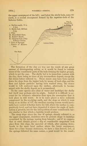 | Keywords: The Quarterly journal of the Geological Society of London (12895114593).jpg 1864 <br> WITCHELL STROUD <br> 379 <br> the upper escarpment of the hill ; and below the shelly beds some 80 <br> yards is a second escarpment formed by the ragstone-beds of the <br> Inferior Oolite <br> Top of <br> Stroud Hill <br> a Surface-earth 2 to <br> 4 feet <br> b Shelly bed 126 feet <br> long <br> c Clay <br> D Stonesfield Slate <br> E Fuller's Earth <br> F Clypeus-beds of the <br> Inferior Oolite <br> Line of Springs <br> Limits of Excava- <br> tion <br> The formation of the clay c was not the result of any great <br> amount of disintegrating action or it would be found to contain <br> traces of the constituent parts of the beds forming the higher ground <br> which is not the case The shelly bed is in immediate contact with <br> the clay there being no trace of any intermediate deposit except the <br> flat stones before referred to These stones may have been carried <br> down the slope from the higher beds by means of land-slips and the <br> finer and lighter particles having been washed away the stones <br> would be left scattered upon the surface afterwards to become <br> mixed with the shelly deposit as it accumulated <br> To the same agency also that of water and landslips the shelly <br> bed itself may perhaps owe its origin Indeed it is difficult to ac- <br> count for its existence otherwise than upon the assumption that it <br> took place in still water It is in some places a mere sediment <br> compressed by the overlying earth and the slope on which it rests <br> being at an incline of 13° the smallest running stream would inevi- <br> tably have carried it further down the hill where the surface is com- <br> paratively level and not have deposited it where the angle of incli- <br> nation is greatest but for the interposition of some considerable bar- <br> rier similar to that which a landslip would produce <br> The steep slope above the line of springs already referred to as <br> the upper escarpment doubtless owes its present shape to landslips <br> occasioned by the springs issuing from beneath ; and if we suppose <br> that at some distant period a slip of considerable magnitude took <br> place from this slope the material of which after passing down- <br> wards to the more level surface above the lower escarpment <br> there for a time became stationary we have a dam formed and as <br> the springs followed the same course a pond would be the result ; 36089644 111261 51125 Page 379 Text v 20 http //www biodiversitylibrary org/page/36089644 1864 Geological Society of London Biodiversity Heritage Library The Quarterly journal of the Geological Society of London v 20 1864 Geology Periodicals Smithsonian Libraries bhl page 36089644 dc identifier http //biodiversitylibrary org/page/36089644 smithsonian libraries Information field Flickr posted date ISOdate 2014-03-03 Check categories 2015 August 26 CC-BY-2 0 BioDivLibrary https //flickr com/photos/61021753 N02/12895114593 2015-08-26 16 56 03 cc-by-2 0 PD-old-70-1923 The Quarterly journal of the Geological Society of London 1864 Photos uploaded from Flickr by Fæ using a script |