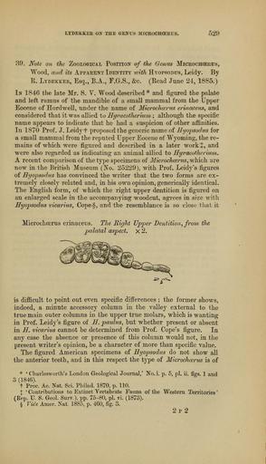 | Keywords: The Quarterly journal of the Geological Society of London (13889873748).jpg LYDEKKEK ON THE GENUS MICROCHOCRUS 529 <br> 39 Note on the Zoological Position of the Genus MiCROCHCEEUSy <br> Wood and its Appaeent Identity luith Hyopsodtjs Leidy By <br> K Lydekker Esq B A F G S c Eead June 24 1885 <br> In 1846 the late Mr S V Wood described and figured the palate <br> and left ramus of the mandible of a small mammal from the Upper <br> Eocene of Hordwell under the name of MicrocJioerus erinaceus and <br> considered that it was allied to Hyracotherium ; although the specific <br> name appears to indicate that he had a suspicion of other affinities <br> In 1870 Prof J Leidy t proposed the generic name of Hyopsodus for <br> a small mammal from the reputed Upper Eocene of Wyoming the re- <br> mains of which were figured and described in a later workt and <br> were also regarded as indicating an animal allied to Hyracotherium <br> A recent comparison of the type specimens of Microchosrus which are <br> now in the British Museum No 25229 with Prof Leidy \s figures <br> of Hyopsodus has convinced the writer that the two forms are ex- <br> tremely closely related and in his own opinion generically identical <br> The English form of which the right upper dentition is figured on <br> an enlarged scale in the accompanying woodcut agrees in size with <br> Hyopsodus vicarius Cope§ and the resemblance is so close that it <br> Microchoerus erinaceus The Right Upper Dentition from the <br> palatal aspect x 2 <br> is difficult to point out even specific differences ; the former shows <br> indeed a minute accessory column in the valley external to the <br> true main outer columns in the upper true molars which is wanting <br> in Prof Leidy's figure of H paidus but whether present or absent <br> in H vicarius cannot be determined from Prof Cope's figure In <br> any case the absence or presence of this column would not in the <br> present writer's opinion be a character of more than specific value <br> The figured American specimens of Hyopsodus do not show all <br> the anterior teeth and in this respect the type of Microchoerus is of <br> Charlesworth's London Geological Journal ' No i p 5 pi ii figs 1 and <br> 3 1846 <br> t Proc Ac Nat Sci Philad 1870 p 110 <br> I ' Contributions to Extinct Vertebrate Fauna of the Western Territories ' <br> Rep U S Geol Surv pp 75-80 pi vi 1873 <br> § Vic'e Amer Nat 188o p 460 fig 3 <br> 2p 2 37047409 114009 51125 Page 529 Text 41 http //www biodiversitylibrary org/page/37047409 1885 Geological Society of London NameFound H paidus NameFound Hyopsodus NameConfirmed Hyopsodus EOLID 4524732 NameBankID 4199624 NameFound Hyopsodus vicarius NameFound Hyracotherium NameConfirmed Hyracotherium EOLID 4452113 NameBankID 4203387 NameFound Microchoerus NameConfirmed Microchoerus EOLID 3064462 NameBankID 4242100 NameFound Microchoerus erinaceus NameConfirmed Microchoerus erinaceus Wood 1846 EOLID 4523233 NameFound Microchosrus Biodiversity Heritage Library The Quarterly journal of the Geological Society of London v 41 1885 Geology Periodicals Smithsonian Libraries bhl page 37047409 dc identifier http //biodiversitylibrary org/page/37047409 smithsonian libraries Information field Flickr posted date ISOdate 2014-04-30 Check categories 2015 August 26 CC-BY-2 0 BioDivLibrary https //flickr com/photos/61021753 N02/13889873748 2015-08-26 04 58 07 cc-by-2 0 PD-old-70-1923 The Quarterly journal of the Geological Society of London 1885 Photos uploaded from Flickr by Fæ using a script |