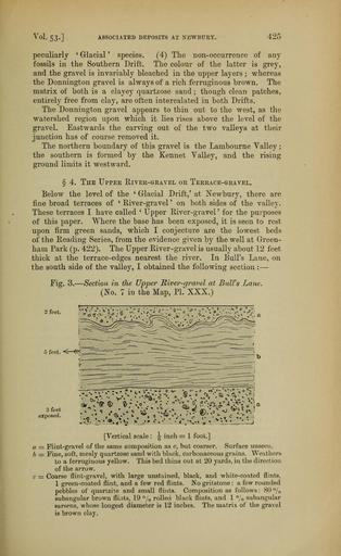 Keywords: The Quarterly journal of the Geological Society of London (12894038054).jpg Vol 53 ASSOCIATED DEPOSITS AT NEWBURY 425 <br> peculiarly ' Glacial ' species 4 The non-occurrence of any <br> fossils in the Southern Drift The colour of the latter is grey <br> and the gravel is invariably bleached in the upper layers ; whereas <br> the Donnington gravel is always of a rich ferruginous brown The <br> matrix of both is a clayey quartzose sand ; though clean patches <br> entirely free from clay are often intercalated in both Drifts <br> The Donnington gravel appears to thin out to the west as the <br> watershed region upon which it lies rises above the level of the <br> gravel Eastwards the carving out of the two valleys at their <br> junction has of course removed it <br> The northern boundary of this gravel is the Lambourne Valley ; <br> the southern is formed by the Kennet Valley and the rising <br> ground limits it westward <br> § 4 The Upper Eiver-gravel or Terrace-gravel <br> Below the level of the ' Glacial Drift ' at Newbury there are <br> fine broad terraces of ' Eiver-gravel ' on both sides of the valley <br> These terraces I have called ' Upper Eiver-gravel' for the purposes <br> of this paper Where the base has been exposed it is seen to rest <br> upon firm green sands which I conjecture are the lowest beds <br> of the Eeading Series from the evidence given by the well at Green- <br> ham Park p 422 The Upper Eiver-gravel is usually about 12 feet <br> thick at the terrace-edges nearest the river In Bull's Lane on <br> the south side of the valley I obtained the following section ” <br> Pig 3 ” Section in the Upper River-gravel at Bull's Lane <br> No 7 in the Map PL XXX <br> 2 feet <br> 3 feet -« ¢ ¢ \ sC ' V - ' ‚¬ ' b l V~ <br> exposed ¢ / - w ž « -V ' –  C V –  - –  j <br> Vertical scale -g- inch 1 foot <br> a Flint-gravel of the same composition as c but coarser Surface unseen <br> b Fine soft mealy quartzose sand with black carbonaceous grains Weathers <br> to a ferruginous yellow This bed thins out at 20 yards in the direction <br> of the arrow <br> c Coarse flint-gravel with large unstained black and white-coated flints <br> 1 green-coated flint and a few red flints No gritstone a few rounded <br> pebbles of quartzite and small flints Composition as follows 80 <br> subangular brown flints 19 °/ rolled black flints and 1 subangular <br> sarsens whose longest diameter is 12 inches The matrix of the gravel <br> is brown clay 36029248 111130 51125 Page 425 Text 53 http //www biodiversitylibrary org/page/36029248 1897 Geological Society of London Biodiversity Heritage Library The Quarterly journal of the Geological Society of London v 53 1897 Geology Periodicals Smithsonian Libraries bhl page 36029248 dc identifier http //biodiversitylibrary org/page/36029248 smithsonian libraries Information field Flickr posted date ISOdate 2014-03-03 Check categories 2015 August 26 CC-BY-2 0 BioDivLibrary https //flickr com/photos/61021753 N02/12894038054 2015-08-26 16 58 27 cc-by-2 0 PD-old-70-1923 The Quarterly journal of the Geological Society of London 1897 Photos uploaded from Flickr by Fæ using a script