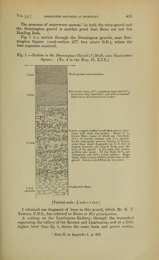 Keywords: The Quarterly journal of the Geological Society of London (12894031494).jpg Vol 53- <br> ASSOCIATED DEPOSITS AT NEWBURY <br> 42 5 <br> The presence of waterworn sarsens in both the river-gravel and <br> the Donnington gravel is another proof that these are not the <br> Reading Beds <br> Fig 1 is a section through the Donnington gravels near Don- <br> nington Square road-surface 277 feet above O D where the <br> best exposure occurred <br> Fig 1 ” Section in the Bonnington Glacial Drift near Bonninqton <br> Square No 4 in the Map PI XXX <br> 2 feet <br> Made ground and macadam <br> Fine brown loam 50 ° o qnarfczose sand and 50 <br> tenacious clay laminated and with occasional <br> faint traces of carbonaceous matter <br> Coarse roughly bedded sandy flint-gravel some- <br> times with dark clay-matrix About 83 ° o <br> brown flints some of which are bleached <br> 10 ° o of various colours and 5 ° q greyish- <br> brown subangular sarsens varying in dimen- <br> sions from small fragments up to 3 feet in <br> longest diameter the largest being near the <br> base of the gravel A few grits and sarsen- <br> pebbles also occur Of the flints 60 °_p are <br> subangular and 40 rolled pebbles Large <br> black white-coated nodules at the base of the <br> gravel Green-coated flints are very rare <br> Chalk- with-flints <br> Vertical scale -g- inch 1 foot <br> I obtained one fragment of bone in this gravel which Mr E T <br> Newton F R S has referred to Bison or Bos primigenius <br> A cutting on the Larabourne Railway through the watershed <br> separating the valleys of the Kennet and Lambourne and at a little <br> higher level than fig 1 shows the same loam and gravel resting <br> Note II in Appendix I p 433 36029246 111130 51125 Page 423 Text 53 http //www biodiversitylibrary org/page/36029246 1897 Geological Society of London NameFound Bos primigenius NameConfirmed Bos primigenius EOLID 11021570 NameBankID 2813453 Biodiversity Heritage Library The Quarterly journal of the Geological Society of London v 53 1897 Geology Periodicals Smithsonian Libraries bhl page 36029246 dc identifier http //biodiversitylibrary org/page/36029246 smithsonian libraries Information field Flickr posted date ISOdate 2014-03-03 Check categories 2015 August 26 CC-BY-2 0 BioDivLibrary https //flickr com/photos/61021753 N02/12894031494 2015-08-26 16 55 33 cc-by-2 0 PD-old-70-1923 The Quarterly journal of the Geological Society of London 1897 Photos uploaded from Flickr by Fæ using a script |