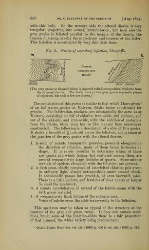 | Keywords: The Quarterly journal of the Geological Society of London (12893585345).jpg of a slice of this gneiss <br> It shows a breadth of § inch cut across the foliation and is taken at <br> the junction of the grey gneiss with the altered diorite <br> 1 A seam of minute transparent granules generally elongated in <br> the direction of foliation many of them being lenticular in <br> shape It is rarely possible to determine which of these <br> are quartz and which felspar bat scattered among them are <br> several comparatively large lenticles of quartz Some minute <br> crystals of epidote elongated with the foliation are present <br> 2 A dark seam chiefly composed of interfelted chlorite pale green <br> in ordinary light almost extinguishing under crossed nicols <br> It occasionally passes into greenish or even brownish mica <br> There is a little epidote and lenticles of clear quartz or felspar <br> lie amid the meshwork <br> 3 A minute interfoliation of several of the felsitic seams with the <br> dark green material <br> 4 A comparatively thick folium of the chloritic rock <br> Yeins of calcite cross the slide transversely to the foliation <br> This specimen may be taken as typical of the structure at the <br> junction of the grey and green rocks It does not contain much <br> mica but in some of the junction-slides there is a fair proportion <br> of that mineral the white variety being predominant <br> Quart Journ Geol Soc vol xlv 1889 p 496 vol xlix 1893 p 412 36029165 111130 51125 Page 356 Text 53 http //www biodiversitylibrary org/page/36029165 1897 Geological Society of London Biodiversity Heritage Library The Quarterly journal of the Geological Society of London v 53 1897 Geology Periodicals Smithsonian Libraries bhl page 36029165 dc identifier http //biodiversitylibrary org/page/36029165 smithsonian libraries Information field Flickr posted date ISOdate 2014-03-03 Check categories 2015 August 26 CC-BY-2 0 BioDivLibrary https //flickr com/photos/61021753 N02/12893585345 2015-08-26 17 56 17 cc-by-2 0 PD-old-70-1923 The Quarterly journal of the Geological Society of London 1897 Photos uploaded from Flickr by Fæ using a script |