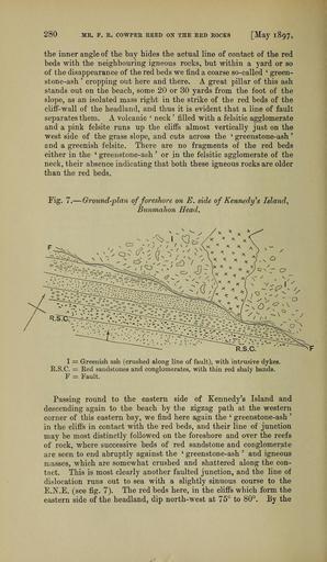 | Keywords: The Quarterly journal of the Geological Society of London (12893937954).jpg 280 <br> ME F R COWPER REED OX THE RED ROCKS May 1 897 <br> the inner angle of the bay hides the actual line of contact of the red <br> beds with the neighbouring igneous rocks but within a yard or so <br> of the disappearance of the red beds we find a coarse so-called ' green- <br> stone-ash ' cropping out here and there A great pillar of this ash <br> stands out on the beach some 20 or 30 yards from the foot of the <br> slope as an isolated mass right in the strike of the red beds of the <br> cliff-wall of the headland and thus it is evident that a line of fault <br> separates them A volcanic ' neck ' filled with a felsitic agglomerate <br> and a pink felsite runs up the cliffs almost vertically just on the <br> west side of the grass slope and cuts across the ' greenstone-ash ' <br> and a greenish felsite There are no fragments of the red beds <br> either in the ' greenstone-ash ' or in the felsitic agglomerate of the <br> neck their absence indicating that both these igneous rocks are older <br> than the red beds <br> Pig 7 ” Ground-plan of foreshore on E side of Kennedy's Island <br> Bunmalion Head <br> I ” Greenish ash crushed along line of fault with intrusive dykes <br> R S C Red sandstones and conglomerates with thin red shaly bands <br> F Fault <br> Passing round to the eastern side of Kennedy's Island and <br> descending again to the beach by the zigzag path at the western <br> corner of this eastern bay we find here again the ' greenstone-ash ' <br> in the cliffs in contact with the red beds and their line of junction <br> may be most distinctly followed on the foreshore and over the reefs <br> of rock where successive beds of red sandstone and conglomerate <br> are seen to end abruptly against the ' greenstone-ash ' and igneous <br> masses which are somewhat crushed and shattered along the con- <br> tact This is most clearly another faulted junction and the line of <br> dislocation runs out to sea with a slightly sinuous course to the <br> E N E see fig 7 The red beds here in the cliffs which form the <br> eastern side of the headland dip north-west at 75° to 80° By the 36029065 111130 51125 Page 280 Text 53 http //www biodiversitylibrary org/page/36029065 1897 Geological Society of London Biodiversity Heritage Library The Quarterly journal of the Geological Society of London v 53 1897 Geology Periodicals Smithsonian Libraries bhl page 36029065 dc identifier http //biodiversitylibrary org/page/36029065 smithsonian libraries Information field Flickr posted date ISOdate 2014-03-03 Check categories 2015 August 26 CC-BY-2 0 BioDivLibrary https //flickr com/photos/61021753 N02/12893937954 2015-08-26 17 54 53 cc-by-2 0 PD-old-70-1923 The Quarterly journal of the Geological Society of London 1897 Photos uploaded from Flickr by Fæ using a script |