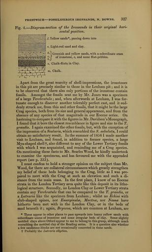 Keywords: The Quarterly journal of the Geological Society of London (12826763354).jpg PRESTWICH FOSSILIFEROUS IRONSANDS N DOWNS 327 <br> Fig 4 Diagram-section of the Ironsands in their original hori- <br> zontal position <br> t ffS iMWWr M f Yellow sands passing down into <br> pjjjjil 2 ' EJ e Light-red sand and clay <br> l~ ~ y i\ d ' I Greenish and yellow sands with a subordinate seam <br> i l ' jr of ironstone c and some flint-pebbles <br> V _ r -- <br> Wm SB a Chalk-flints m Clay <br> Apart from the great scarcity of shell-impressions the ironstones <br> in this pit are precisely similar to those in the Lenham pit ; and it is <br> to be observed that there also only portions of the ironstone contain <br> fossils Amongst the fossils sent me by Mr Jones was a specimen <br> of a large Terebratula ; and when afterwards at Lenham I was for- <br> tunate enough to discover another tolerably perfect cast and it sud- <br> denly struck me from this and other fossils that it might be the large <br> Crag species both from its size and general appearance and from the <br> absence of any species of that magnitude in our Eocene series On <br> hastening to compare it with the figures in Mr Davidson' s Monograph <br> I found that it bore the closest resemblance in figure and size to the T <br> grandis I again examined the other fossils but with the exception of <br> the impression of a Scalaria which resembled the S subulata I could <br> obtain no satisfactory result In the summer of 1856 I made another <br> visit to Lenham and found in addition to former species a large <br> Mya-shaped shell f also different to any of the Lower Tertiary fossils <br> with which I was acquainted and reminding me of a Crag species <br> On mentioning these facts to Mr Searles Wood he kindly undertook <br> to examine the specimens and has favoured me with the appended <br> report see p 333 <br> I must confess to hold a stronger opinion on the subject than Mr <br> Wood for there are collateral circumstances which greatly strengthen <br> my belief of these beds belonging to the Crag little as I was pre- <br> pared to meet with the Crag at such an elevation and such a di- <br> stance from the main mass In the first place I know of no Eocene <br> strata in the London Tertiary area quite like this deposit in its litho- <br> logical structure Secondly no London Clay or Lower Tertiary strata <br> contain any Terebratula that can be compared to the T grandis or <br> a Lutraria like the specimen from Lenham ; whilst no Echini with <br> club-shaped spines nor Emarginuloe Mactrce nor Nassce have <br> hitherto been met with in the London Clay or in the beds of <br> sand beneath it ; again Bryozoa which are common at Lenham are <br> These appear in other places to pass upwards into loamy yellow sands with <br> subordinate seams of ironstone and some irregular beds of clay Some slightly <br> mottled clays above Otford appear to me to belong to this group although much <br> resembling the mottled clay of the Reading series It is a question also whether <br> a few sandstone-blocks are not occasionally concreted in these sands <br> f Probably the Lutraria elliptica 36214301 111684 51125 Page 327 Text v 14 http //www biodiversitylibrary org/page/36214301 1858 Geological Society of London NameFound Bryozoa NameConfirmed Bryozoa EOLID 2060 NameBankID 230461 NameFound Echini NameConfirmed Echini NameFound Lutraria NameConfirmed Lutraria EOLID 57862 NameBankID 2693297 NameFound Lutraria elliptica NameConfirmed Lutraria elliptica NameFound Scalaria NameConfirmed Scalaria EOLID 4856646 NameBankID 245500 NameFound Scalaria subulata NameConfirmed Scalaria subulata NameFound Terebratula NameConfirmed Terebratula EOLID 13755808 NameBankID 4365172 NameFound Terebratula grandis NameConfirmed Terebratula grandis NameBankID 5549820 Biodiversity Heritage Library The Quarterly journal of the Geological Society of London v 14 1858 Geology Periodicals Smithsonian Libraries bhl page 36214301 dc identifier http //biodiversitylibrary org/page/36214301 smithsonian libraries Information field Flickr posted date ISOdate 2014-02-28 Check categories 2015 August 26 CC-BY-2 0 BioDivLibrary https //flickr com/photos/61021753 N02/12826763354 2015-08-26 17 56 34 cc-by-2 0 PD-old-70-1923 The Quarterly journal of the Geological Society of London 1858 Photos uploaded from Flickr by FĂŚ using a script |