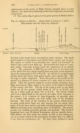 | Keywords: The Quarterly journal of the Geological Society of London (12736458285).jpg '80 <br> E HILL AND T G BONNE Y ON Til K <br> agglomerate of the centre of High Towers resemble these in some <br> respects ; but there the weathering renders the fragments exceedingly <br> conspicuous <br> 18 The section fig 5 given by the great quarry in Bardon Hill is <br> Fig 5 ” Section at Bardon Scale about 4 inches to 1 mile <br> This section cuts the beds very obliquely <br> w s w <br> E N E <br> Eailway Birch Tree Inn <br> Quarry <br> Crest of Hill <br> the best in the forest but is nevertheless rather obscure The small <br> patch marked as Greenstone near Robin Butts cannot now be seen <br> The quarry on which it was founded was small and deserted in <br> Jukes's time and is now filled up He describes the stone as com- <br> pact earthy trap-rock having much the appearance of an altered <br> rock The exposures at Hill Top are well seen in the back yard <br> of the Birch Tree Inn where banded slates and grits much shattered <br> dip at the steep angle of 80° to W S W An old pit in a neighbouring <br> garden shows also slates with gritty bands and a similar dip The <br> cleavage is rather imperfect From this point to the mouth of the <br> quarry is a distance of about a quarter of a mile with no rock ex- <br> posed Then the ground begins to ascend rapidly forming a long <br> high and narrow ridge rising at its centre to the highest elevation <br> of the county 902 feet The dip of the rocks is seen in two shaly <br> bands cut by the quarry which strike E 15° S or E S E and <br> dip at a steep angle of about 60° to N N E The lowest visible <br> rock is in a small knoll in the wood to the right of the entrance to <br> the quarry ; it is a breccia of large fragments of greenish slate <br> in a coarse ashy matrix not very unlike that of the Bradgaie <br> breccias The rocks at the entrance to the quarry which cannot <br> be many yards above these are also breccias but are much indu- <br> rated of much finer matrix and with included fragments of entirely <br> different material more resembling those at Whitwick The matrix <br> is ashy but variable generally greyish and speckled The included <br> fragments have very ill defined boundaries and are usually darker <br> Then follows the first shaly bed which as well as the subsequent <br> one is so much rotted by the percolation of water that it is difficult <br> to say what its constituents are We have been inclined to think 35818957 110705 51125 Page 780 Text 33 http //www biodiversitylibrary org/page/35818957 1877 Geological Society of London Biodiversity Heritage Library The Quarterly journal of the Geological Society of London v 33 1877 Geology Periodicals Smithsonian Libraries bhl page 35818957 dc identifier http //biodiversitylibrary org/page/35818957 smithsonian libraries Information field Flickr posted date ISOdate 2014-02-24 Check categories 2015 August 26 CC-BY-2 0 BioDivLibrary https //flickr com/photos/61021753 N02/12736458285 2015-08-26 19 58 32 cc-by-2 0 PD-old-70-1923 The Quarterly journal of the Geological Society of London 1877 Photos uploaded from Flickr by Fæ using a script |