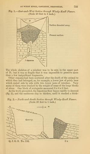 | Keywords: The Quarterly journal of the Geological Society of London (12736411225).jpg AT WINDY KNOLL CASTLETON DERBYSHIRE <br> 725 <br> Fig 1 East-and- West Section through Windy-Knoll Fissure <br> Scale 20 feet to 1 inch <br> ' Surface denuded away <br> Present surface <br> y Cavern <br> 7 <br> The whole skeleton of a reindeer was to be seen in the upper part <br> of B ; but it was so fragile that it was impossible to preserve more <br> than a few insignificant fragments <br> Other remains had been scattered after the death of the animal to <br> which they had belonged as for example a lower jaw of grisly bear <br> which rested side by side with two lower jaws of reiudeer Very <br> many of them were crushed by the weight of some of the large blocks <br> of stone One block of stalagmite measured 8x6x2 feet <br> As the work proceeded the limestone floor began rapidly to descend <br> fig 2 and the ossiferous clay to thicken until it reached a thick- <br> Fig 2 North-and-South Section through Windy-Knoll Fissure <br> Scale 20 feet to 1 inch <br> Q J G S No 132 35818902 110705 51125 Page 725 Text 33 http //www biodiversitylibrary org/page/35818902 1877 Geological Society of London Biodiversity Heritage Library The Quarterly journal of the Geological Society of London v 33 1877 Geology Periodicals Smithsonian Libraries bhl page 35818902 dc identifier http //biodiversitylibrary org/page/35818902 smithsonian libraries Information field Flickr posted date ISOdate 2014-02-24 Check categories 2015 August 26 CC-BY-2 0 BioDivLibrary https //flickr com/photos/61021753 N02/12736411225 2015-08-26 19 58 10 cc-by-2 0 PD-old-70-1923 The Quarterly journal of the Geological Society of London 1877 Photos uploaded from Flickr by FĂŚ using a script |