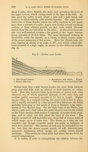 | Keywords: The Quarterly journal of the Geological Society of London (12736294595).jpg 678 <br> R L JACK AND J HORNE ON GLACIAL DRIFT <br> about 5 miles above Szigeth the main road ascends to the level of <br> the upper terrace which sweeps south to the base of the hills At <br> this point the valley is only about a mile and a half broad and <br> seems to be filled entirely with alluvial deposits The same fact is <br> observable at Gross Bocsko where the valley narrows to not much <br> more than a quarter of a mile Again near Lonka several excellent <br> sections of these alluvial gravels are met with which likewise <br> stretch from the one hill-slope to the other At this point there are <br> also two well-marked terraces ; the gravel of the upper terrace <br> being upwards of 20 feet thick The same horizontal beddiug is <br> discernible while the deposit as a whole is pretty coarse many <br> of the stones measuring 2 feet across Here the Flysch-beds are <br> seen dipping up stream at an angle of 20° and within a short dis- <br> tance reversed at a high angle as shown in the following section <br> fig 2 <br> Fig 2 ” Section near Lonka <br> a Old alluvial terrace <br> b Kecent alluvium <br> Sandstones and shales Flysch- <br> beds thrown into a synclinal fold <br> Bather more than a mile beyond Lonka the river flows between <br> steep pine-clad hills with no alluvial or drift-deposits on either <br> bank Near this however three large erratics of quartz rock were <br> observed one of which measured upwards of 90 cubic feet and <br> another partly concealed upwards of 10 feet in length Higher <br> up the valley in a roadside-cutting the quartz rock is seen in place <br> and is rapidly succeeded by a fine-grained blue limestone the latter <br> probably belonging to the patch of Dyas or Permian rocks repre- <br> sented in Yon Hauer's map On the right bank of the Theiss just <br> about a mile and a half below the point where it receives the waters <br> of the Visso another drift-section is exposed It occurs on the road- <br> side and is about 100 feet above the level of the river The <br> deposit consists of stiff dark-blue clay stuck full of stones some of <br> which range up to 8 cubic feet The blocks as a rule are not <br> rounded ; and though a careful search was made no instances of <br> striae were observed The absence of such may be accounted for by <br> the fact that the stones consist mainly of soft brownish- grey <br> micaceous sandstones which would not readily retain glacial <br> markings This section is about 2050 feet above the sea-level by <br> aneroid measurement <br> It is worthy of note as exemplifying the relation between the 35818855 110705 51125 Page 678 Text 33 http //www biodiversitylibrary org/page/35818855 1877 Geological Society of London NameFound Dyas NameConfirmed Dyas NameBankID 4870430 Biodiversity Heritage Library The Quarterly journal of the Geological Society of London v 33 1877 Geology Periodicals Smithsonian Libraries bhl page 35818855 dc identifier http //biodiversitylibrary org/page/35818855 smithsonian libraries Information field Flickr posted date ISOdate 2014-02-24 Check categories 2015 August 26 CC-BY-2 0 BioDivLibrary https //flickr com/photos/61021753 N02/12736294595 2015-08-26 19 54 45 cc-by-2 0 PD-old-70-1923 The Quarterly journal of the Geological Society of London 1877 Photos uploaded from Flickr by Fæ using a script |