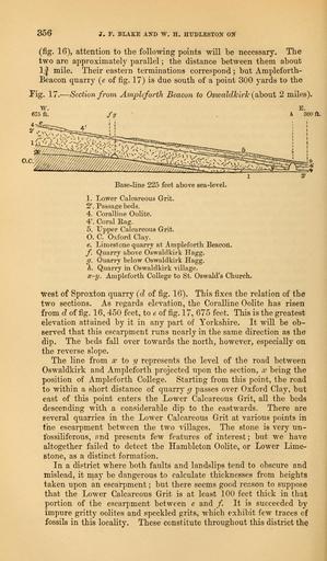 Keywords: The Quarterly journal of the Geological Society of London (12736009735).jpg 356 <br> J F BLAKE AND W H H1JDLEST0N ON <br> fig 16 attention to the following points will be necessary The <br> two are approximately parallel ; the distance between them about <br> 1 J mile Their eastern terminations correspond ; but Ampleforth- <br> Beacon quarry e of fig 17 is due south of a point 300 yards to the <br> Fig 17 ” Section from Ampleforth Beacon to Oswaldkirlc about 2 miles <br> w <br> 675 ft <br> ac v;vvvx ; <br> Base-line 225 feet above sea-level <br> 1 Lower Calcareous Grit <br> 2' Passage beds <br> 4 Coralline Oolite <br> 4\ Coral Rag <br> 5 Upper Calcareous Grit <br> O C Oxford Clay <br> e Limestone quarry at Ampleforth Beacon <br> f Quarry above Oswaldkirk Hagg <br> g Quarry below Oswaldkirk Hagg <br> h Quarry in Oswaldkirk village <br> x-y Ampleforth College to St Oswald's Church <br> West of Sproxton quarry cl of fig 16 This fixes the relation of the <br> two sections As regards elevation the Coralline Oolite has risen <br> from d of fig 16 450 feet to e of fig 17 675 feet This is the greatest <br> elevation attained by it in any part of Yorkshire It will be ob- <br> served that this escarpment runs nearly in the same direction as the <br> dip The beds fall over towards the north however especially on <br> the reverse slope <br> The line from x to y represents the level of the road between <br> Oswaldkirk and Ampleforth projected upon the section x being the <br> position of Ampleforth College Starting from this point the road <br> to within a short distance of quarry g passes over Oxford Clay but <br> east of this point enters the Lower Calcareous Grit all the beds <br> descending with a considerable dip to the eastwards There are <br> several quarries in the Lower Calcareous Grit at various points in <br> the escarpment between the two villages The stone is very un- <br> tbssiliferous and presents few features of interest; but we have <br> altogether failed to detect the Hambleton Oolite or Lower Lime- <br> stone as a distinct formation <br> In a district where both faults and landslips tend to obscure and <br> mislead it may be dangerous to calculate thicknesses from heights <br> taken upon an escarpment ; but there seems good reason to suppose <br> that the Lower Calcareous Grit is at least 100 feet thick in that <br> portion of the escarpment between e and / It is succeeded by <br> impure gritty oolites and speckled grits which exhibit few traces of <br> fossils in this locality These constitute throughout this district the 35818485 110705 51125 Page 356 Text 33 http //www biodiversitylibrary org/page/35818485 1877 Geological Society of London Biodiversity Heritage Library The Quarterly journal of the Geological Society of London v 33 1877 Geology Periodicals Smithsonian Libraries bhl page 35818485 dc identifier http //biodiversitylibrary org/page/35818485 smithsonian libraries Information field Flickr posted date ISOdate 2014-02-24 Check categories 2015 August 26 CC-BY-2 0 BioDivLibrary https //flickr com/photos/61021753 N02/12736009735 2015-08-26 20 00 49 cc-by-2 0 PD-old-70-1923 The Quarterly journal of the Geological Society of London 1877 Photos uploaded from Flickr by Fæ using a script |