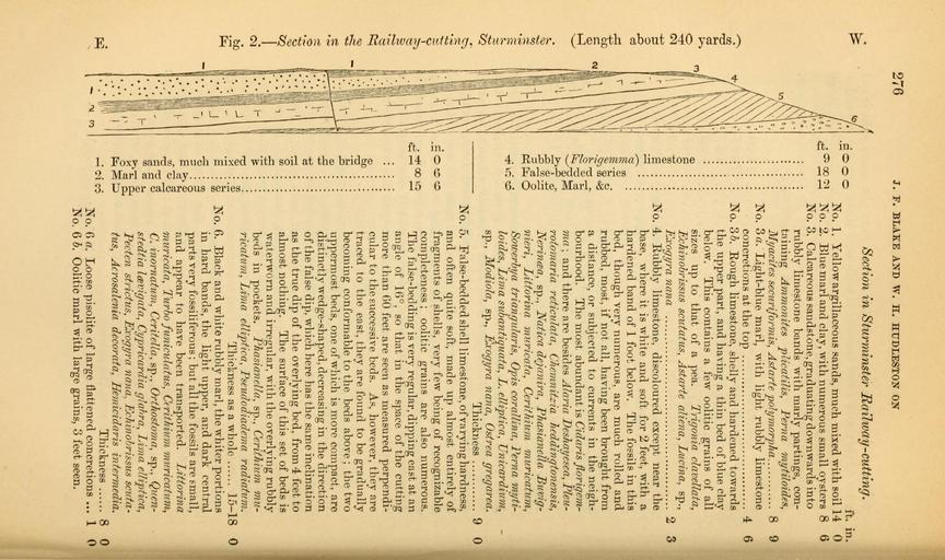| Keywords: The Quarterly journal of the Geological Society of London (12736038943).jpg 276 <br> J F BLAKE AND W H HTTDLESTON ON <br> Section in Sturminster Railway -cutting <br> u <br> a <br> <br> O <br> N <br> O <br> jo <br> a <br> 4-3 <br> fee <br> c <br> x <br> -1 <br> 5Q <br> <br> S5 <br> I <br> H <br> a oo o <br> ft <br> wis <br> 35 <br> go <br> a <br> 33 <br> x <br> a <br> Hu <br> sj <br> § <br> t -Q <br> -C <br> 0 <br> – u <br> o <br> _d <br> - <br> n <br> tf feo <br> – C O <br> fiOCC <br> _j tH CO vo <br> be <br> H3 <br> o <br> 3 o <br> £ » CD <br> -3 <br> 03 C3 U <br> CD <br> t5 <br> C3 CL <br> m <br> 6 <br> rHCTO <br> No 1 Yellow argillaceous sands much mixed with soil 14 <br> No 2 Blue marl and clay with numerous small oysters 8 <br> No 3 Calcareous sandstone graduating downwards into <br> rubbly limestone bands with marly partings con- <br> taining Ammonites plicatilis Perna mytiloides <br> Myacites securiformis Astarte polymorpha 8 9 <br> No 3 a Light-blue marl with light rubbly limestone <br> concretions at the top 4 6 <br> No 3 b Rough limestone shelly and hardened towards <br> the upper part and having a thin bed of blue clay <br> below This contains a few oolitic grains of all <br> sizes up to that of a pea Trigonia clavellata <br> Echinobrissus scutatus Astarte aliena Lucina sp <br> Exogyra nana 2 3 <br> No 4 Rubbly limestone discoloured except near the <br> base where it is white and soft for 2 feet with a <br> hardened band of 1 foot below The fossils in this <br> bed though very numerous are much rolled and <br> rubbed most if not all having been brought from <br> a distance or subjected to cun ents in the neigh- <br> bourhood The most abundant is Cidaris florigem- <br> ma ; and there are besides Alaria Deshayesca Pleu- <br> rotcmaria reticulata Chcmnitzia heddingtonensis <br> Nerinaa sp Natica dejanira Phasianella Buvig- <br> nieri Littorina muricata Cerithium muricatum <br> Sowerbya triangularis Opis corallina Perna myti- <br> loides Lima subantiquata L elliptica TJnicardium <br> sp Modiola sp Exogyra nana Ostrea gregarea <br> Thickness 9 <br> No 5 False-bedded shell limestone of varying hardness <br> and often quite soft made up almost entirely of <br> fragments of shells very few being of recognizable <br> completeness ; oolitic grains are also numerous <br> The false-bedding is very regular dipping east at an <br> angle of 16° so that in the space of the cutting <br> more than 60 feet are seen as measured perpendi- <br> cular to the successive beds As however they are <br> traced to the east they are found to be gradually <br> becoming conformable to the beds above ; the two <br> uppermost beds one of which is more compact are <br> distinctly wedge-shaped decreasing in the direction <br> of the false dip which here has the same inclination <br> as the true dip of the overlying bed from 4 feet to <br> almost nothing The surface of this set of beds is <br> waterworn and irregular with the overlying rubbly <br> beds in pockets Phasianella sp Cerithium mu- <br> ricatum Lima elliptica Pseudodiadema radiattim <br> Thickness as a whole 15-18 <br> No 6 Black and white rubbly marl the whiter portions <br> in hard bands the light upper and dark central <br> parts very fossiliferous ; but all the fossils are email <br> and appear to have been transported Littorina <br> muricata Turbo funiculatus Cerithium muricatum <br> C inornatum Ceritella sp Orthostoma sp Quen- <br> stedtia laevigata Cypricardia glabra Lima elliptica <br> Pecten strictus Exogyra nana Echinobrissus scuta- <br> tus Acrosalenia decorata Hemicidaris intermedia <br> Thickness 8 <br> No 6 a Loose pisolite of large flattened concretions 1 <br> No 6 b Oolitic marl with large grains 3 feet seen 35818405 110705 51125 Page 276 Text 33 http //www biodiversitylibrary org/page/35818405 1877 Geological Society of London NameFound Acrosalenia decorata NameConfirmed Acrosalenia decorata NameFound Alaria NameConfirmed Alaria EOLID 11310 NameBankID 437617 NameFound Ammonites plicatilis NameFound Astarte aliena NameFound Astarte polymorpha NameFound Ceritella NameConfirmed Ceritella NameBankID 4109124 NameFound Cerithium NameConfirmed Cerithium EOLID 10714569 NameBankID 2684349 NameFound Cerithium inornatum NameFound Cerithium muricatum NameFound Chcmnitzia heddingtonensis NameFound Cidaris NameConfirmed Cidaris EOLID 16738 NameBankID 236951 NameFound Cypricardia glabra NameConfirmed Cypricardia glabrata Phillips 1836 NameBankID 6494199 NameFound Echinobrissus scuta NameConfirmed Echinobrissus NameBankID 4151882 NameFound Echinobrissus scutatus NameConfirmed Echinobrissus scutatus NameFound Exogyra nana NameConfirmed Exogyra nana NameFound Hemicidaris intermedia NameConfirmed Hemicidaris intermedia NameBankID 6038066 NameFound Lima elliptica NameConfirmed Lima elliptica NameFound Lima subantiquata NameConfirmed Arca subantiquata d'Orbigny NameFound Littorina muricata NameConfirmed Littorina muricata Linn NameFound Lucina sp NameConfirmed Lucina Lamarck 1799 EOLID 57504 NameFound Modiola NameConfirmed Modiola EOLID 71417 NameBankID 2647821 NameFound Myacites securiformis NameFound Natica dejanira NameFound Nerinaa sp NameFound Opis corallina NameFound Orthostoma NameConfirmed Orthostoma EOLID 9956 NameBankID 4271378 NameFound Ostrea NameConfirmed Ostrea EOLID 10719983 NameBankID 2692450 NameFound Pecten strictus NameConfirmed Pecten strictus NameBankID 6768052 NameFound Perna NameConfirmed Perna EOLID 59522 NameBankID 4935024 NameFound Perna mytiloides NameConfirmed Perna mytiloides NameFound Phasianella NameConfirmed Phasianella EOLID 3035164 NameBankID 4292306 NameFound Pseudodiadema NameConfirmed Pseudodiadema EOLID 4711764 NameBankID 4318037 NameFound Sowerbya triangularis NameFound Trigonia clavellata NameConfirmed Trigonia clavellata NameFound Turbo funiculatus NameConfirmed Turbo funiculosus Kiener 1848 EOLID 19660404 Biodiversity Heritage Library The Quarterly journal of the Geological Society of London v 3