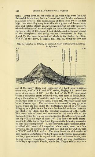 | Keywords: The Quarterly journal of the Geological Society of London (12733842793).jpg PROM ALGIERS TO THE SAHARA 117 <br> Hemiaster or Penaster resembling Penaster Fournelli from the Hip- <br> purite limestone Brissus Avicula Inoceramus Lucina Cardium <br> Area Byssoarca Cardita Cyrena Cwullcea Clavatula c These <br> stand out as bosses from the matrix with a weathered black surface <br> and look like blotches of black mud ; the colour is only skin-deep <br> the mass of the nodules being of a pale grey They are excessively <br> hard and diffictilt to break and probably consist of ferruginous chert <br> The view from the summit of the escarpment is very singular <br> To the south the eye ranges over the great plain interrupted only <br> by the rocky ridge of L'Aghouat ; looking north a gentle dip-slope <br> descends to the flat valley about a mile wide bounded on the opposite <br> side by a complementary dip-slope with a repetition in reverse of the <br> beds seen in ascending the first escarpment The second ridge is <br> soon crossed ; and on descending its escarpment facing north another <br> flat valley about a mile wide is reached bounded on its opposite side <br> by an escarpment facing S E The view from the summits of these <br> ridges presents a series of ranges running N E by S W Fig 2 nearly <br> buried by a Posttertiary deposit of grey loam forming flat valleys <br> about a mile wide each alternate valley occurring between dip-slopes <br> and in the centre of a denuded anticlinal suggesting to the eye the <br> levelling up by a recent deposit of a series of hills and valleys that <br> had originally been of greater height and depth The level valley- <br> bottoms of loam are obviously an inland extension of the plain and <br> were deposited when the Sahara sea ran up as fjords between the <br> promontories of older land that branched out from the isolated land <br> of Algeria <br> Lignite occurs in several localities N of L'Aghouat viz in the <br> Djebel Amour at Kusra and at Berich also at El Kheicha on the banks <br> of the Oued M'Zi a branch of the L'Aghouat river where it is a <br> metre thick and overlain by black rock ; but I had not an opportu- <br> nity of seeing it in situ Fossil plants are said to occur a day's <br> iourney N W of L'Aghouat and are probably associated with the <br> lignite formation The only locality where the lignite has been <br> observed in situ by a geologist is that noticed by Mr Tristram at <br> Ai'n-el-Ibel where it occurs near the horizon of the band of bright <br> red and green marls exposed in several localities on my line of section <br> and probably a little above the horizon of the salt deposit of the <br> Eochers de Sel <br> Of the occurrence of other minerals the following localities were <br> named to me at L'Aghouat ” <br> Nitrate of potash is found near Touat manganese at Outhed el <br> Abiod lead at Oued Sidi Bilgassem and copper at Berich ; but I <br> could not ascertain the mineralogical conditions under which the lead <br> and copper occur <br> My return journey from L'Aghouat following the same line of <br> route enabled me to check and correct the altitudes and fill in addi- <br> tional details in the section <br> Stratigraphical Summary ” In conclusion I will give a general <br> summary in stratigraphical sequence of the formations and of the <br> successive changes of level and contour of the district comprised in 35765986 110599 51125 Page 116 Text v 30 http //www biodiversitylibrary org/page/35765986 1874 Geological Society of London NameFound Avicula NameConfirmed Avicula EOLID 10721231 NameBankID 4633901 NameFound Brissus NameConfirmed Brissus EOLID 73050 NameBankID 2765370 NameFound Byssoarca NameConfirmed Byssoarca NameBankID 4097488 NameFound Cardita NameConfirmed Cardita EOLID 57589 NameBankID 2693146 NameFound Cardium NameConfirmed Cardium EOLID 50301 NameBankID 2693257 NameFound Clavatula NameConfirmed Clavatula EOLID 2988881 NameBankID 4118258 NameFound Cyrena NameConfirmed Cyrena EOLID 4757476 NameBankID 4134596 NameFound Hemiaster NameConfirmed Hemiaster EOLID 599041 NameBankID 2765357 NameFound Inoceramus NameConfirmed Inoceramus EOLID 4747366 NameBankID 4205663 NameFound Penaster NameConfirmed Penaster NameBankID 4287636 Biodiversity Heritage Library The Quarterly journal of the Geological Society of London v 30 1874 Geology Periodicals Smithsonian Libraries bhl page 35765986 dc identifier http //biodiversitylibrary org/page/35765986 smithsonian libraries Information field Flickr posted date ISOdate 2014-02-24 Check categories 2015 August 26 CC-BY-2 0 BioDivLibrary https //flickr com/photos/61021753 N02/12733842793 2015-08-26 19 58 28 cc-by-2 0 PD-old-70-1923 The Quarterly journal of the Geological Society of London 1874 Photos uploaded from Flickr by Fæ using a script |